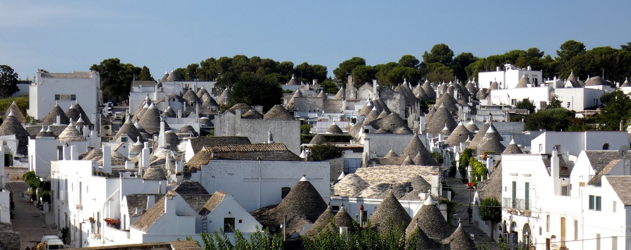 От смотровой площадки Belvedere открывается вид на пепельного цвета многочисленные конусы, которые напоминают сказочную грибницу. Около тысячи конусов сосредоточены в старинном районе Монт (буквально "горы"), улицы которого названы в честь мест сражений Первой мировой войны, где погибло сто альберобеллезцев.