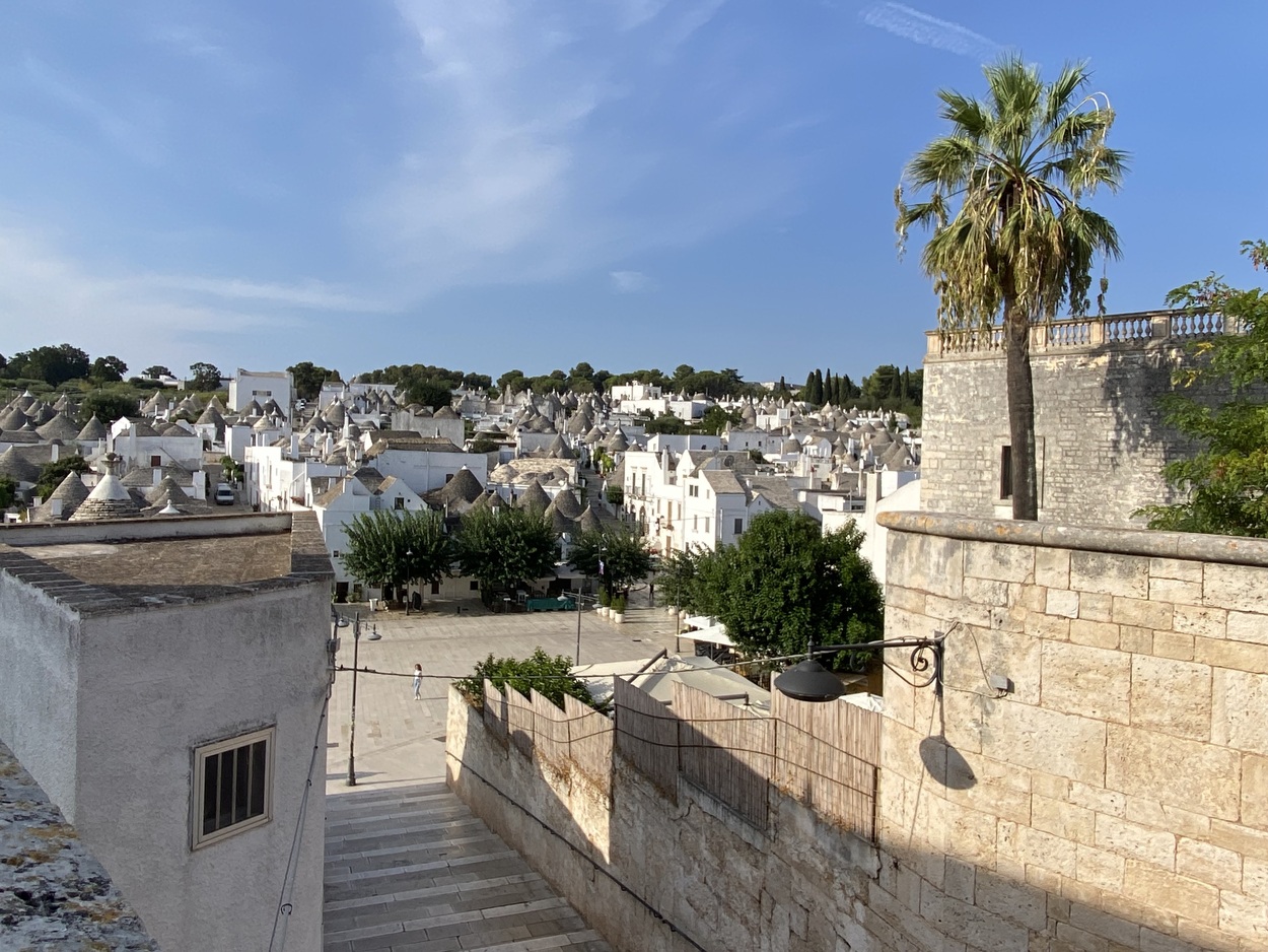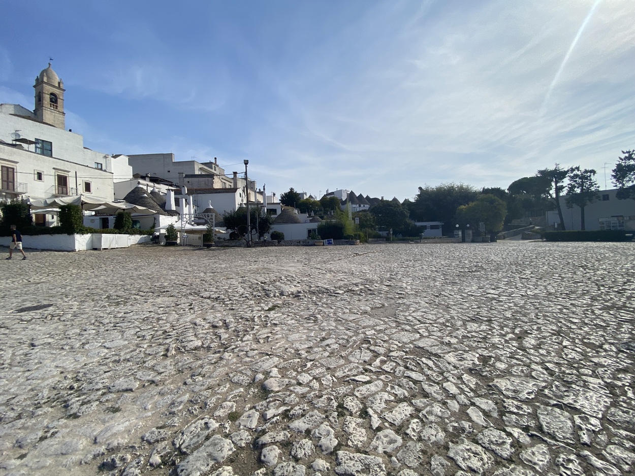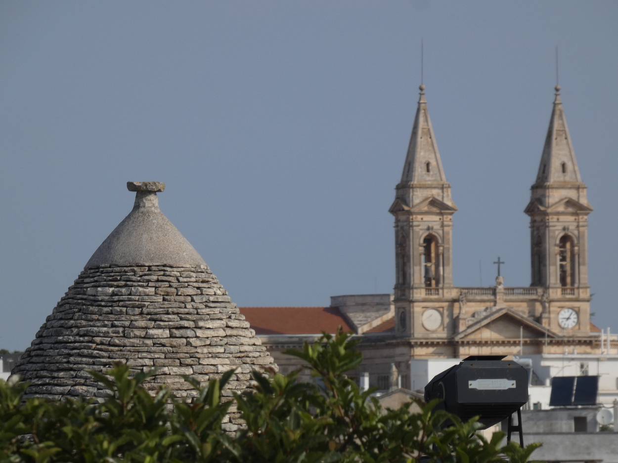 От Бельведера, где находится церковь Сантиссимо, завершенная в 1837 году, открывается вид на Монументальную зону Трулли и Palazzo dei Conti Acquaviva - дворец графа Конти Аквавива ди Конверсано.Это та самая усадьба, которую начал возводить в 1635 году граф Джанджироламо II, впечатлившийся необычностью места. Палаццо доминировал над городом, верхний этаж был предназначен для семьи Аквавива, в нижнем находились мельница, конюшни и кузница.