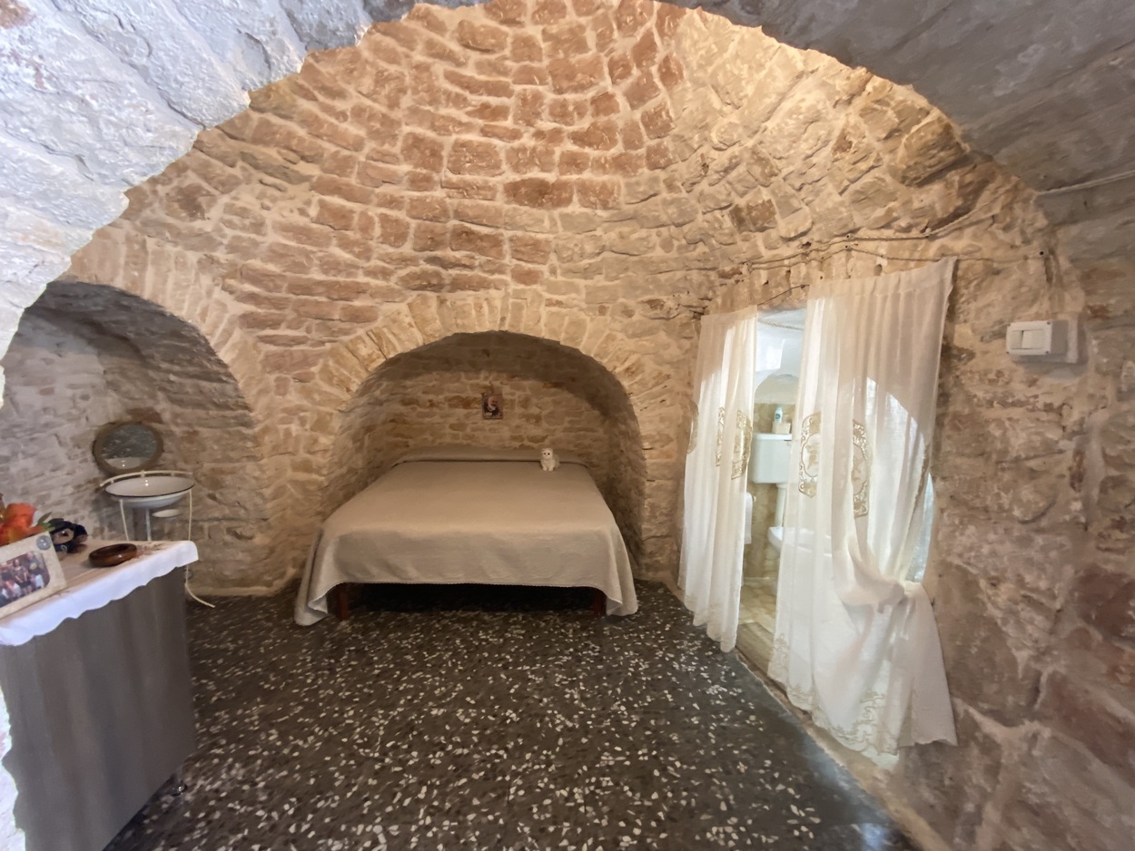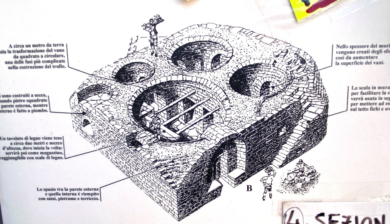 Трулло — это строение с крестовым сводом, который поддерживают четыре романские арки. Внутри есть коническая комната с люком в хранилище для зерна и продуктов в трудные времена.