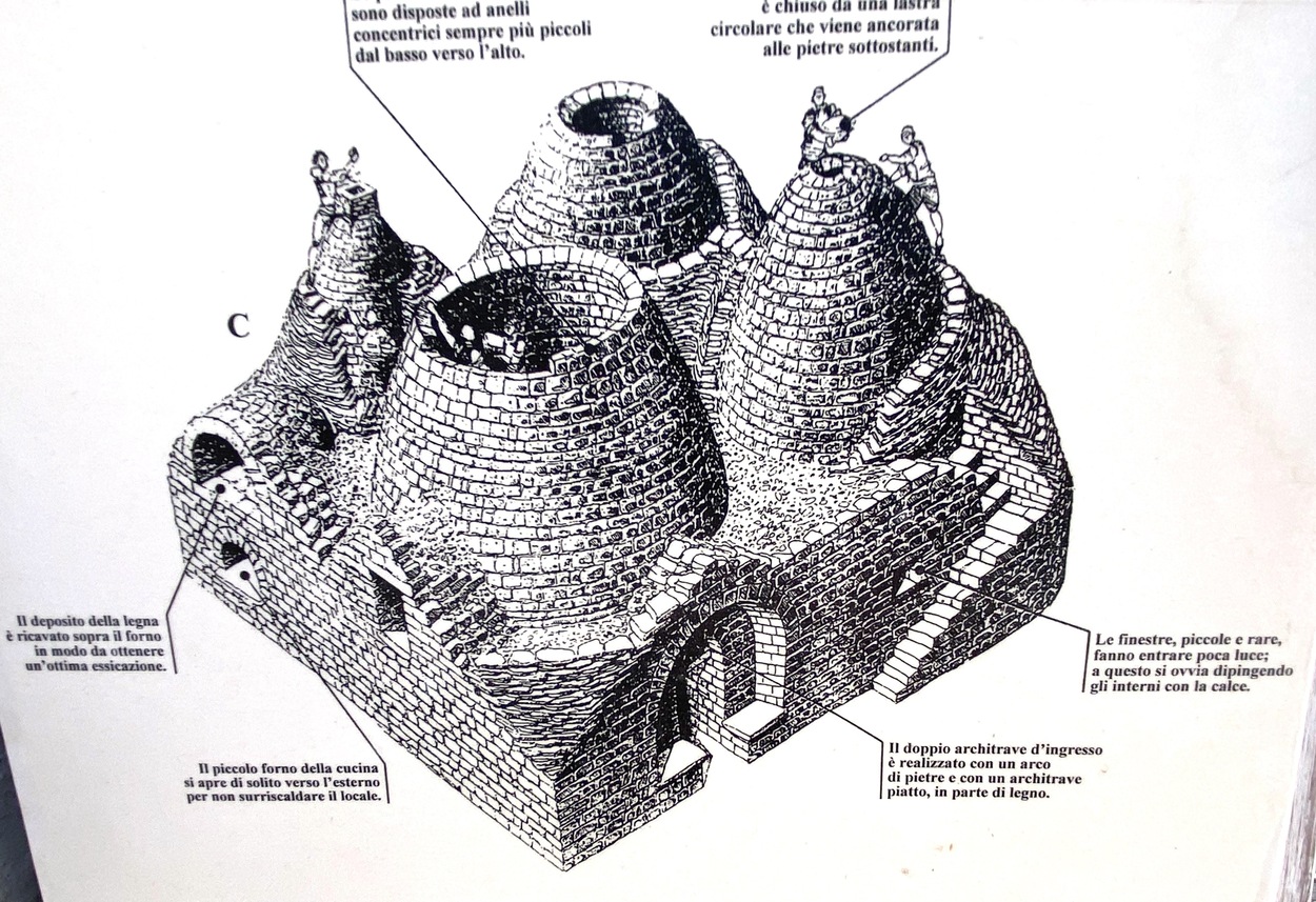 У трулло есть собственная уникальная геометрия: трулло "стоит" на базе главной комнаты - вестибюля, а главный секрет постройки - в устройстве купола.