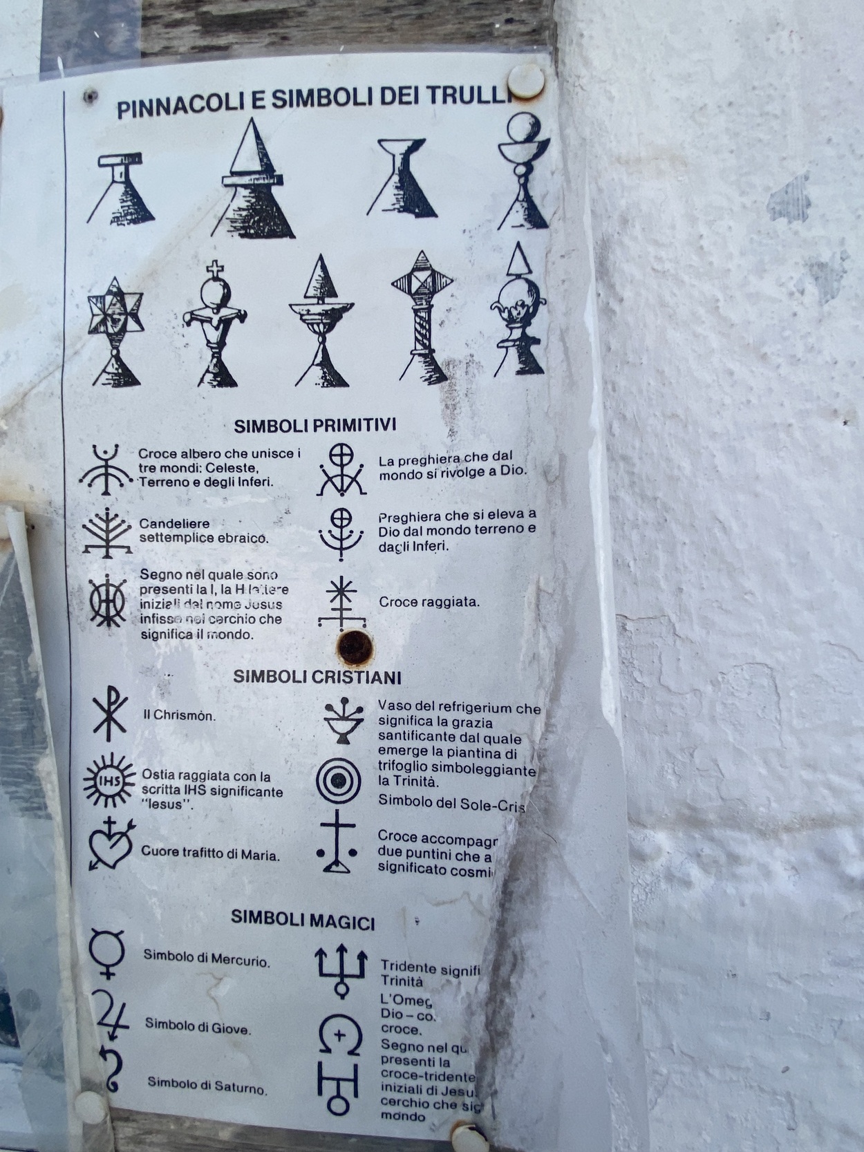 Иконография трулли отражает человеческую потребность в защите. Древняя традиция передавалась из поколения в поколение, сейчас каждое лето старинные символы подновляются известковым раствором. Конечно, теперь эти знаки просто создают эстетическое впечатление, их мистическое значение уже не осознается.