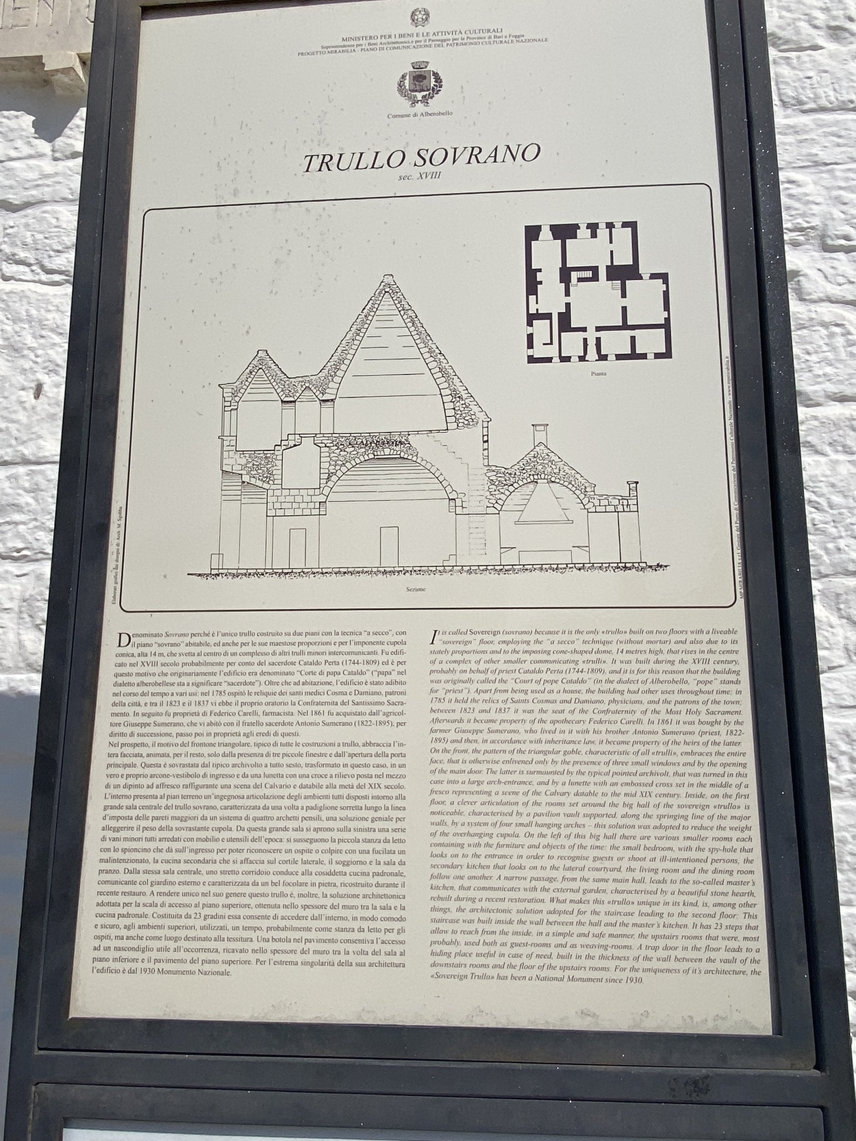 За церковью, на площади Сакраменто, находится еще один удивительный трулло — Trullo Sovrano (Трулло Соврано), названный так в 1916 году.