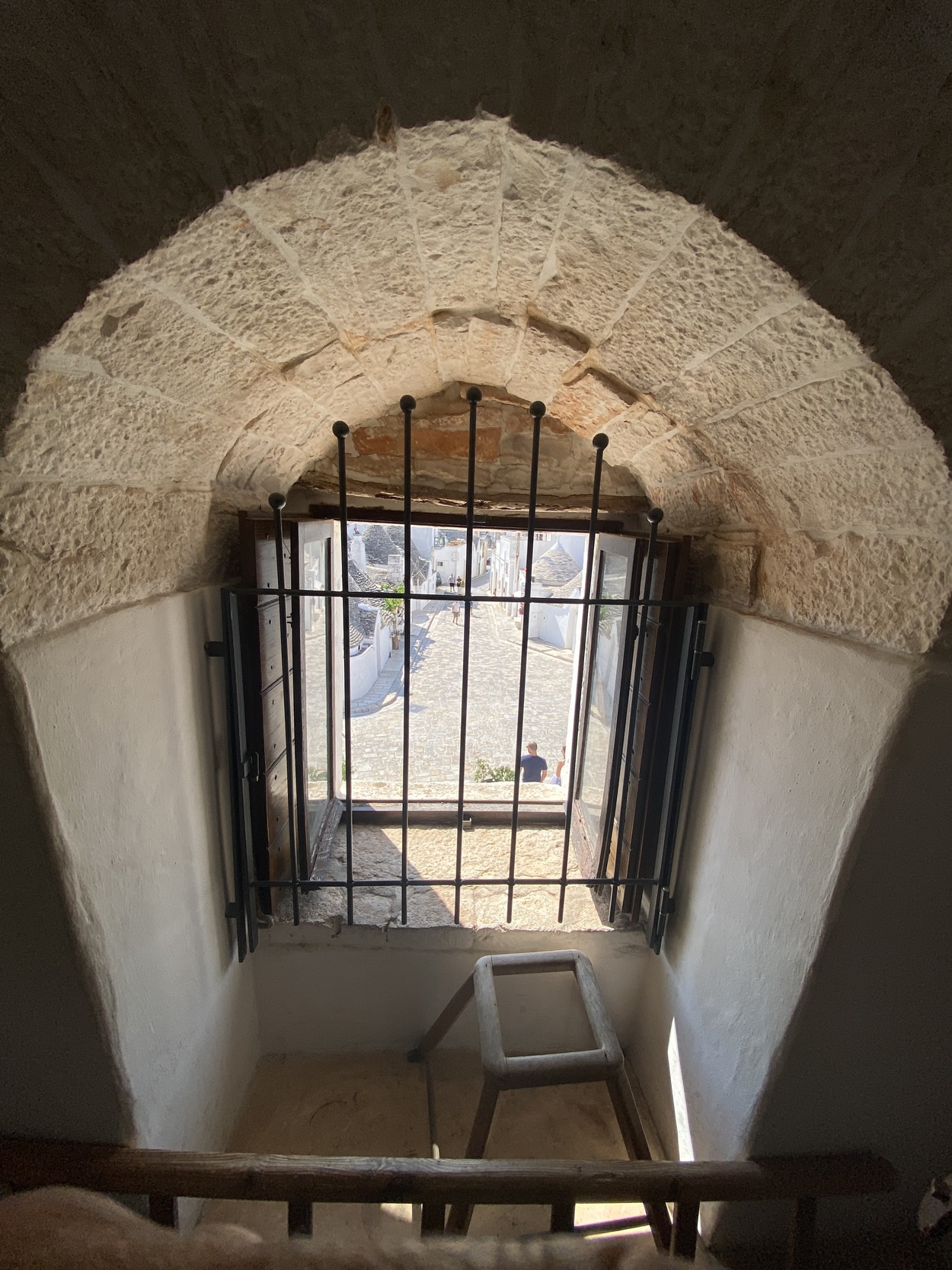 Главный зал Trullo Sovrano - вестибюль, где сейчас продают билеты и книги по краеведению, - это важнейшая и уникальная часть здания. В отличие от других трулли, где потолки обычно деревянные, здесь перекрытие каменное и поддерживается четырьмя романскими арками. Ни в одном другом трулло нет приподнятого этажа, на который можно попасть по внутренней лестнице из 23 ступеней.
