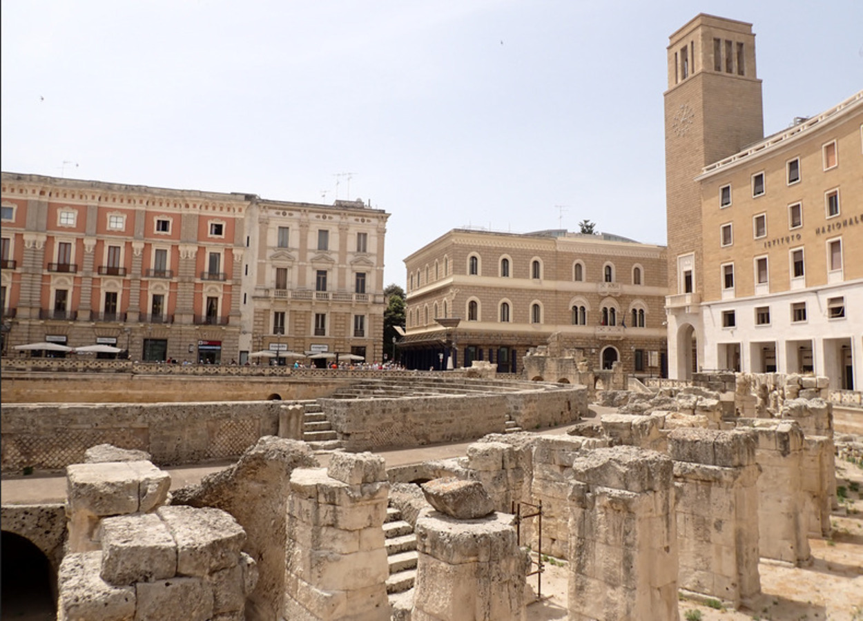 Каменные блоки, которые кое-где выходили из-под земли на поверхность улицы, местные жители принимали за остатки древней римской дороги. Но в 1900 году во время строительства здания Банка Италии археологи догадались, что эти древние камни принадлежат какому-то римскому зданию: так был обнаружен римский амфитеатр, многие столетия скрытый под средневековыми улицами старого Лечче. В 1930-е годы с приходом к власти фашистов прославление римского имперского величия стало актуальным для пропаганды, поэтому было решено римский амфитеатр вытащить из-под земли, для чего потребовалось снести очень много ценных исторических зданий.