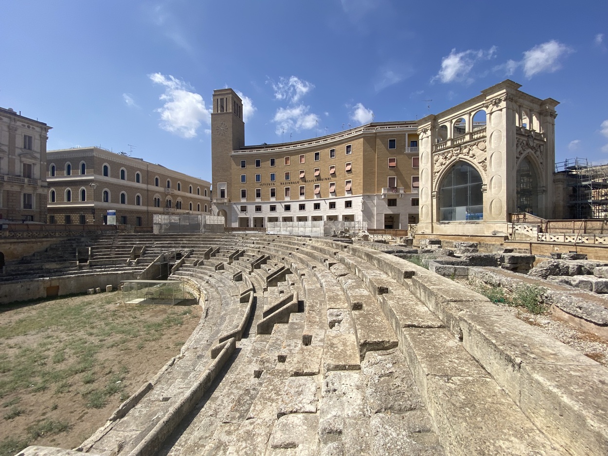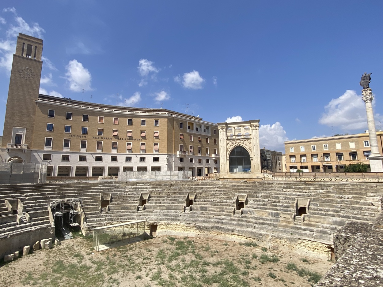 Римский Амфитеатр на поверхности представлен не полностью (остальное под церковью Санта-Мария-делла-Грация и окружающими зданиями), но и та часть, что открыта, впечатляет масштабом. Арена могла вмещать около 20 тысяч зрителей. Статуи и мраморные барельефы, найденные у арены и кавеи (сavea), хранятся в Museo Archeologico Sigismondo Castromediano .