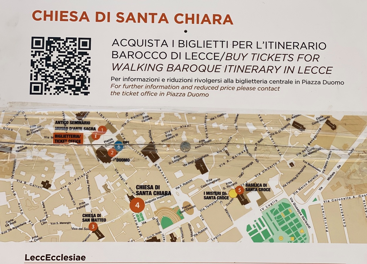 В Лечче создан великолепный туристический маршрут "LeccEcdesiae" — "Открытие барокко", в который входит посещение четырех главных барочных храмов города и музея: Duomo, Basilica di Santa Croce, Chiesa di Santa Chiara, Chiesa di San Matteo, Antico Seminario and Museo di Arte Sacra (MuDAS). Без купленного единого билета в эти храмы не попасть, а с билетом можно смотреть их с утра и до позднего вечера (кроме времени мессы), они не закрываются на сиесту, но только по одному разу каждый объект. Сайт проекта https://www.chieselecce.it/en/info/