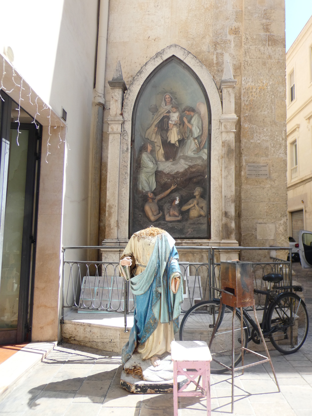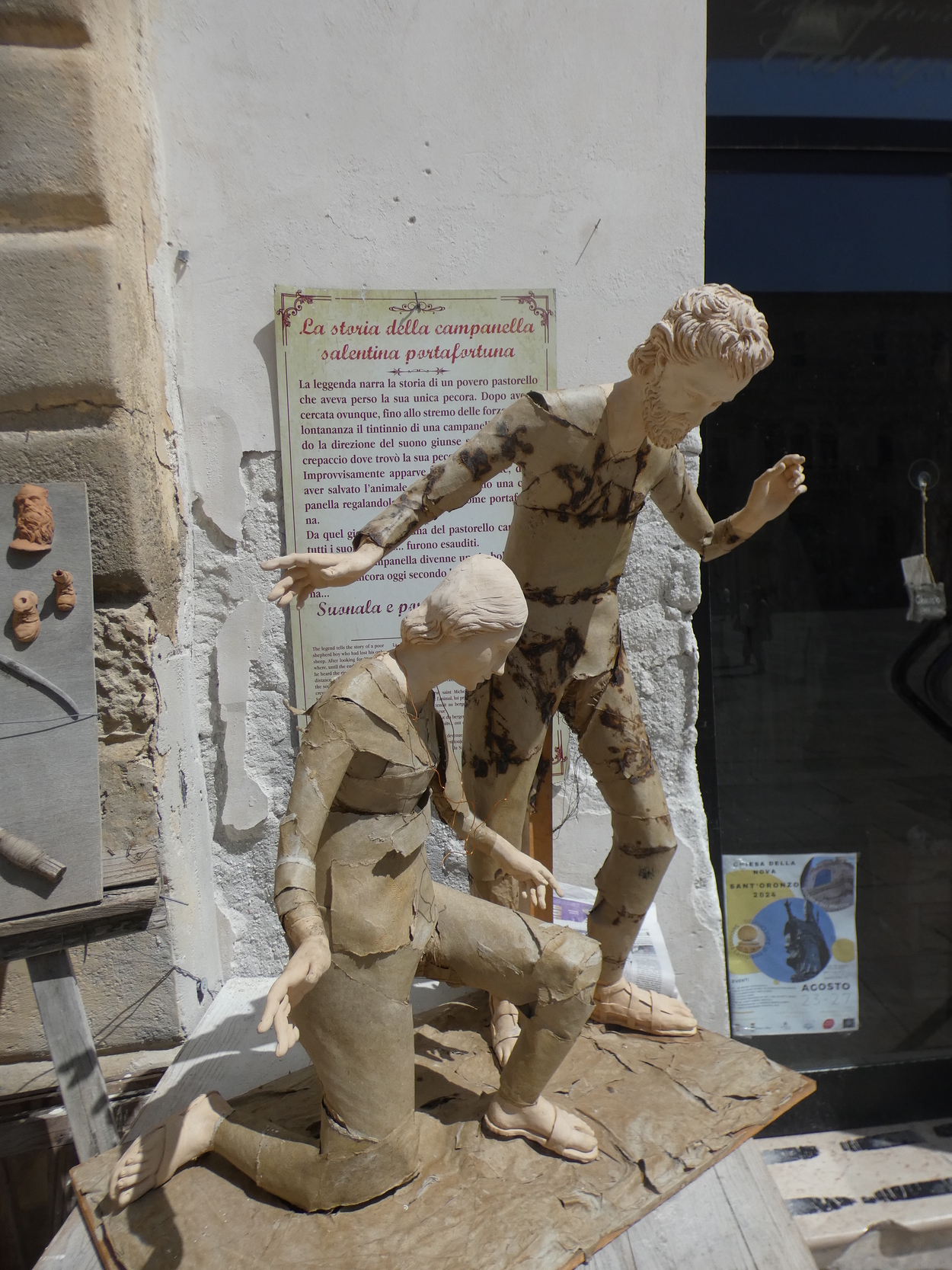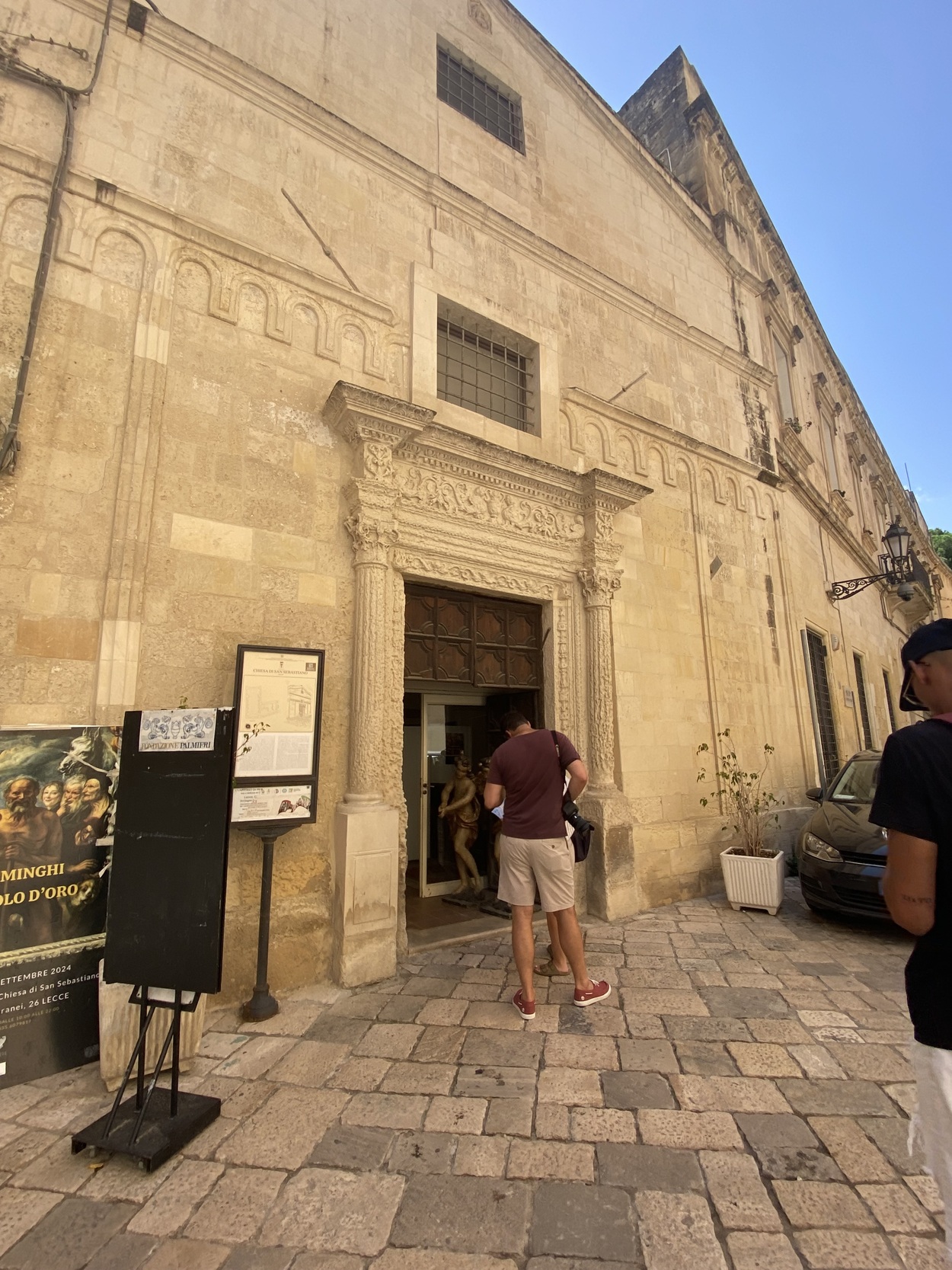 Оказавшись на площади, которую называют "Гостиная Лечче", по правую руку мы увидим пункт туристической информации, но если вам нужен комбинированный билет на барочный маршрут, то здесь вам его не продадут. Для этого нужно пойти в соседнее здание бывшей семинарии Palazzo dell’Antico Seminario, где теперь находится музей религиозного искусства Museum Art MuDAS, в котором комбинированный билет действует. Экспозиция своеобразная, множество объемных изображений святых (возможно, из папье-маше), воспринимать их кукольные лица и позы всерьез невозможно.