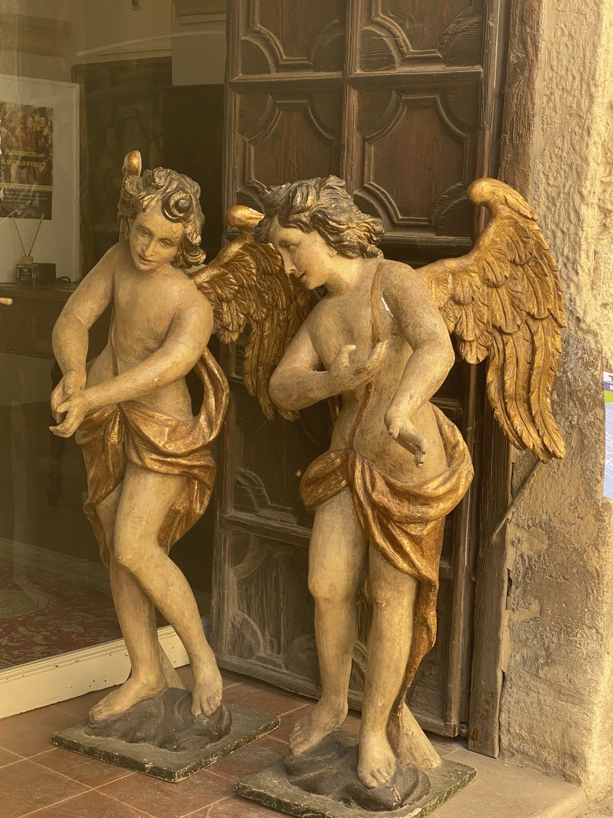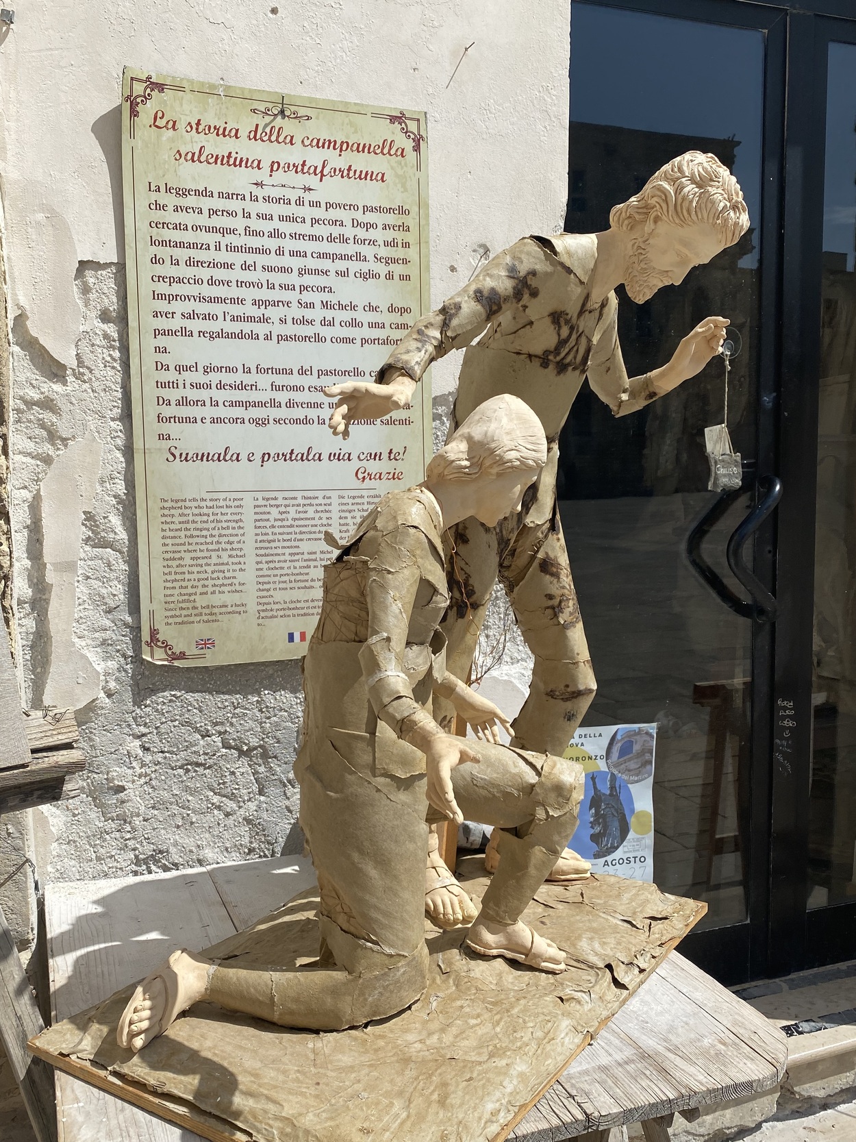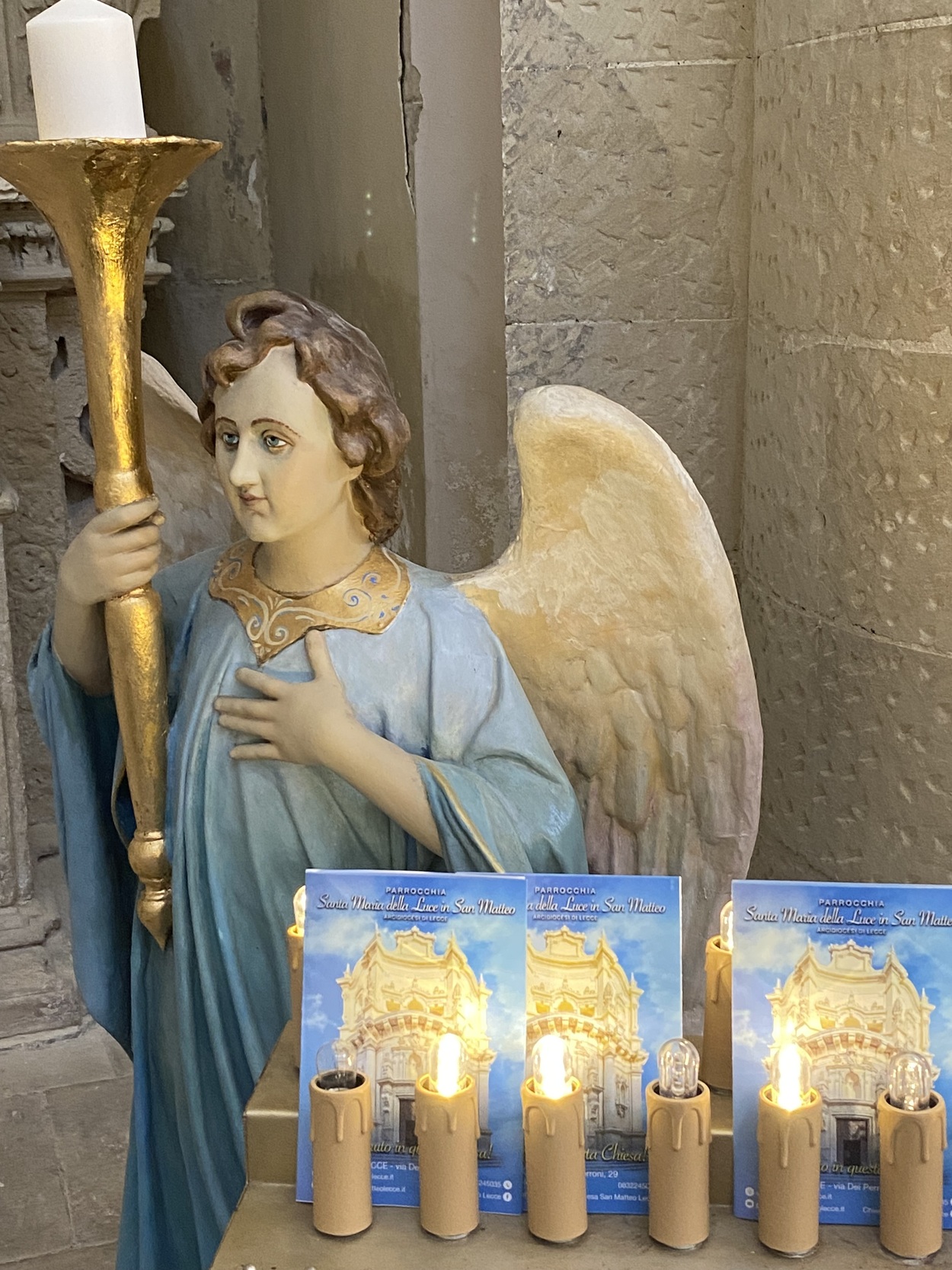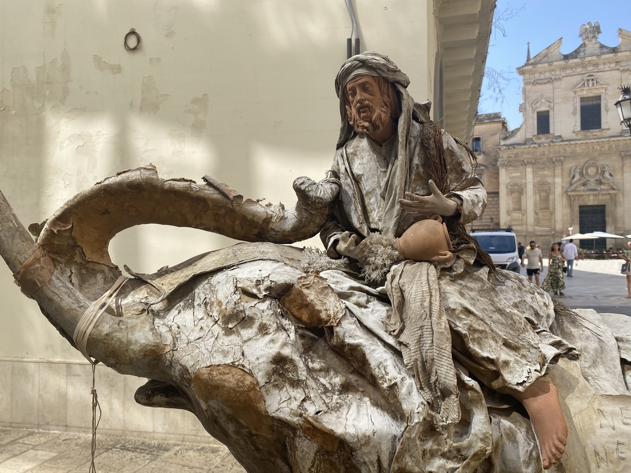 Оказавшись на площади, которую называют "Гостиная Лечче", по правую руку мы увидим пункт туристической информации, но если вам нужен комбинированный билет на барочный маршрут, то здесь вам его не продадут. Для этого нужно пойти в соседнее здание бывшей семинарии Palazzo dell’Antico Seminario, где теперь находится музей религиозного искусства Museum Art MuDAS, в котором комбинированный билет действует. Экспозиция своеобразная, множество объемных изображений святых (возможно, из папье-маше), воспринимать их кукольные лица и позы всерьез невозможно.