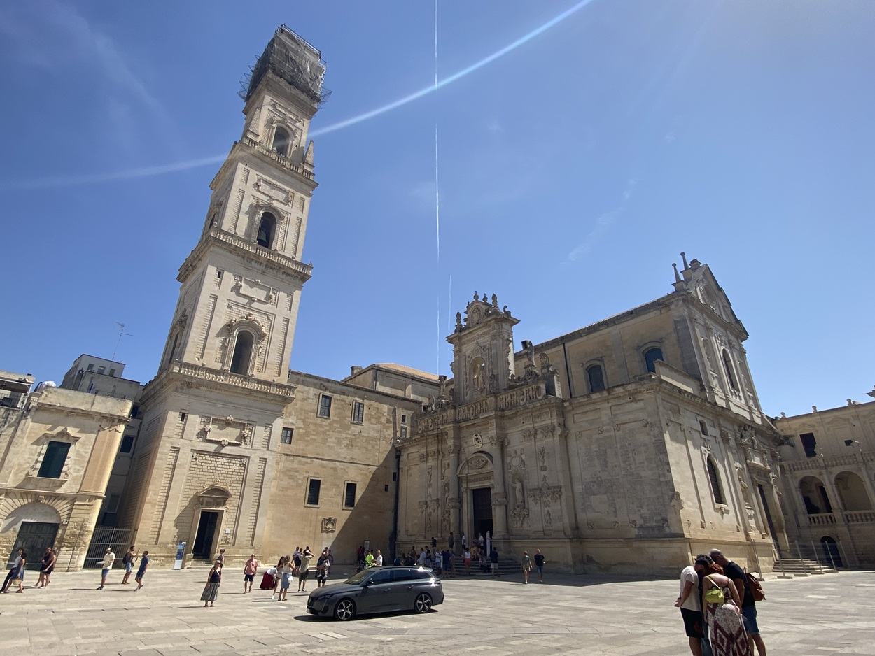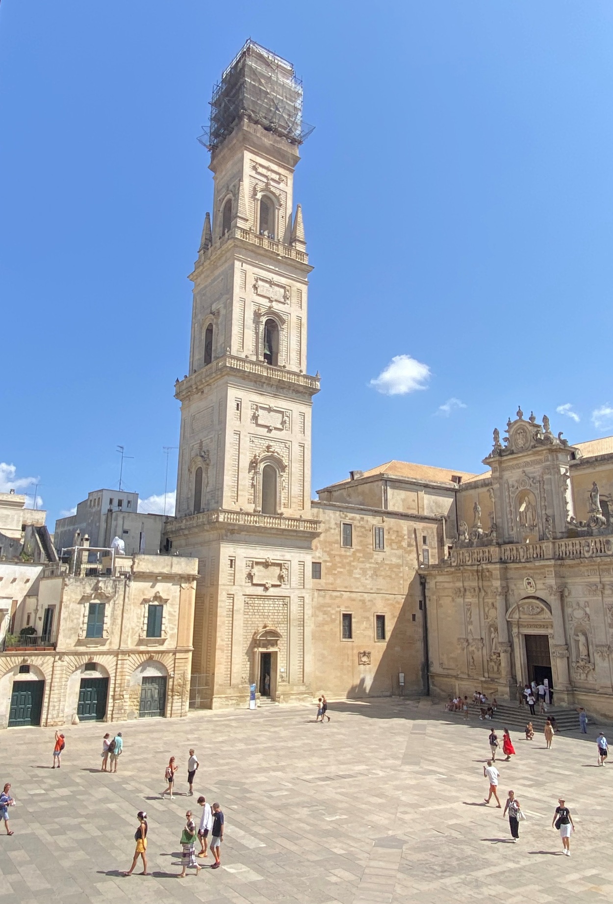Выйдя из музея, направляемся в сторону собора, но взгляд приковывает к себе стоящая напротив высоченная колокольня (кампанила). Ее мы видели еще на подъезде к Лечче.