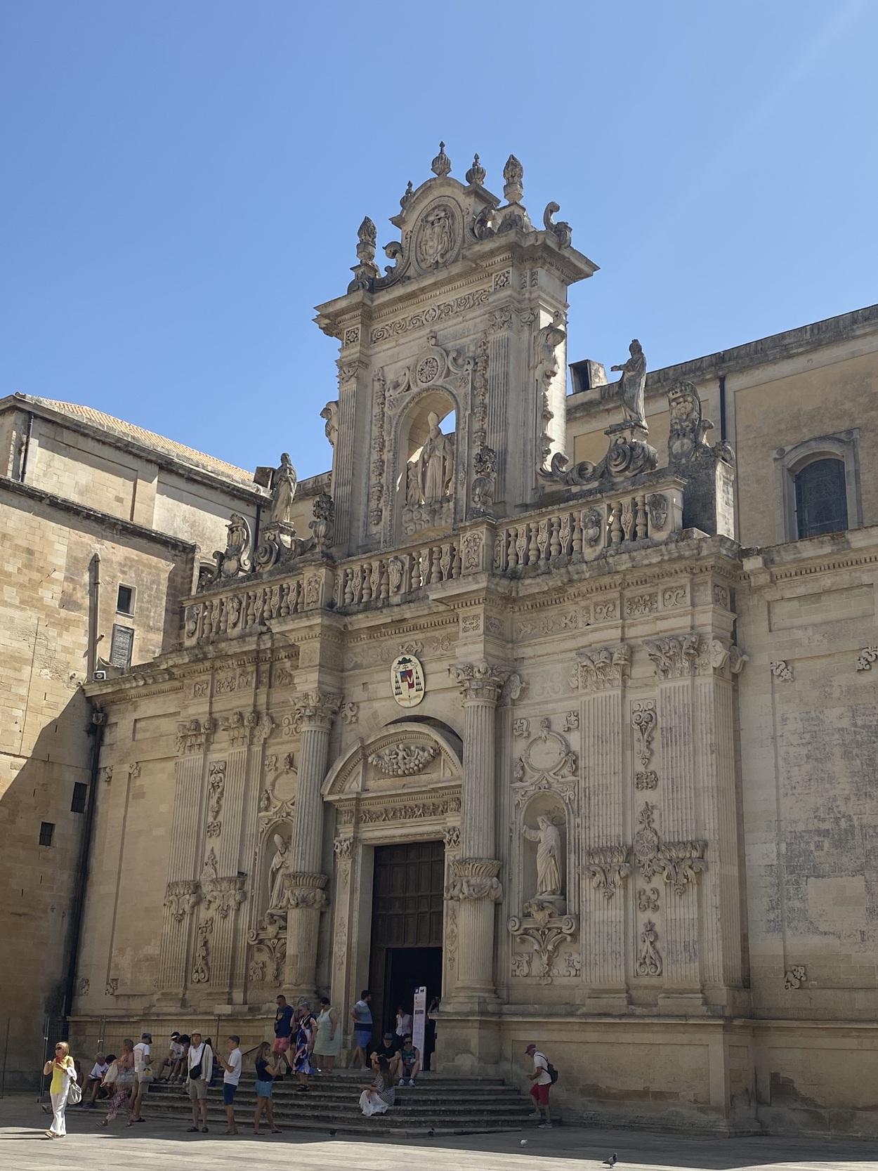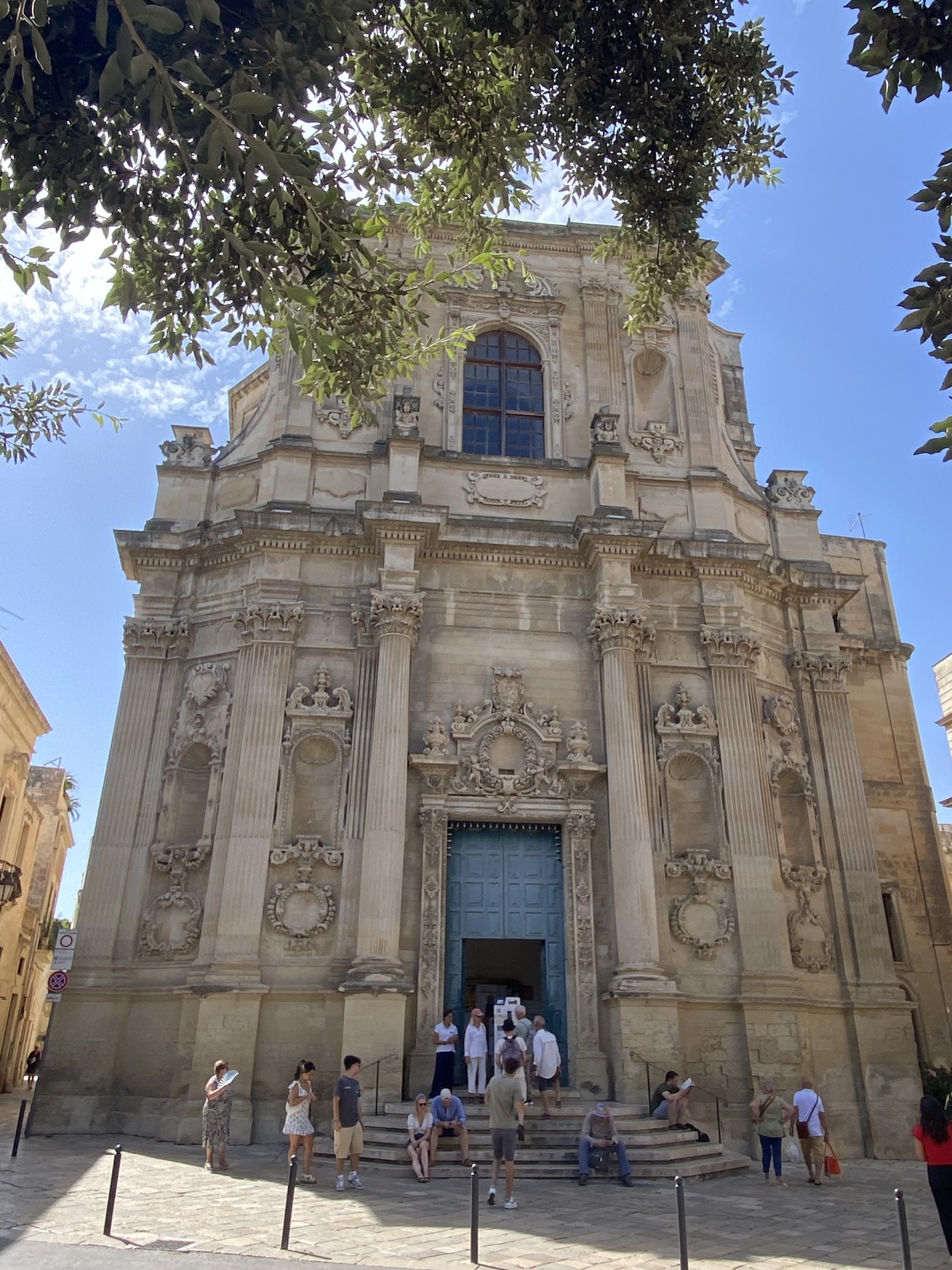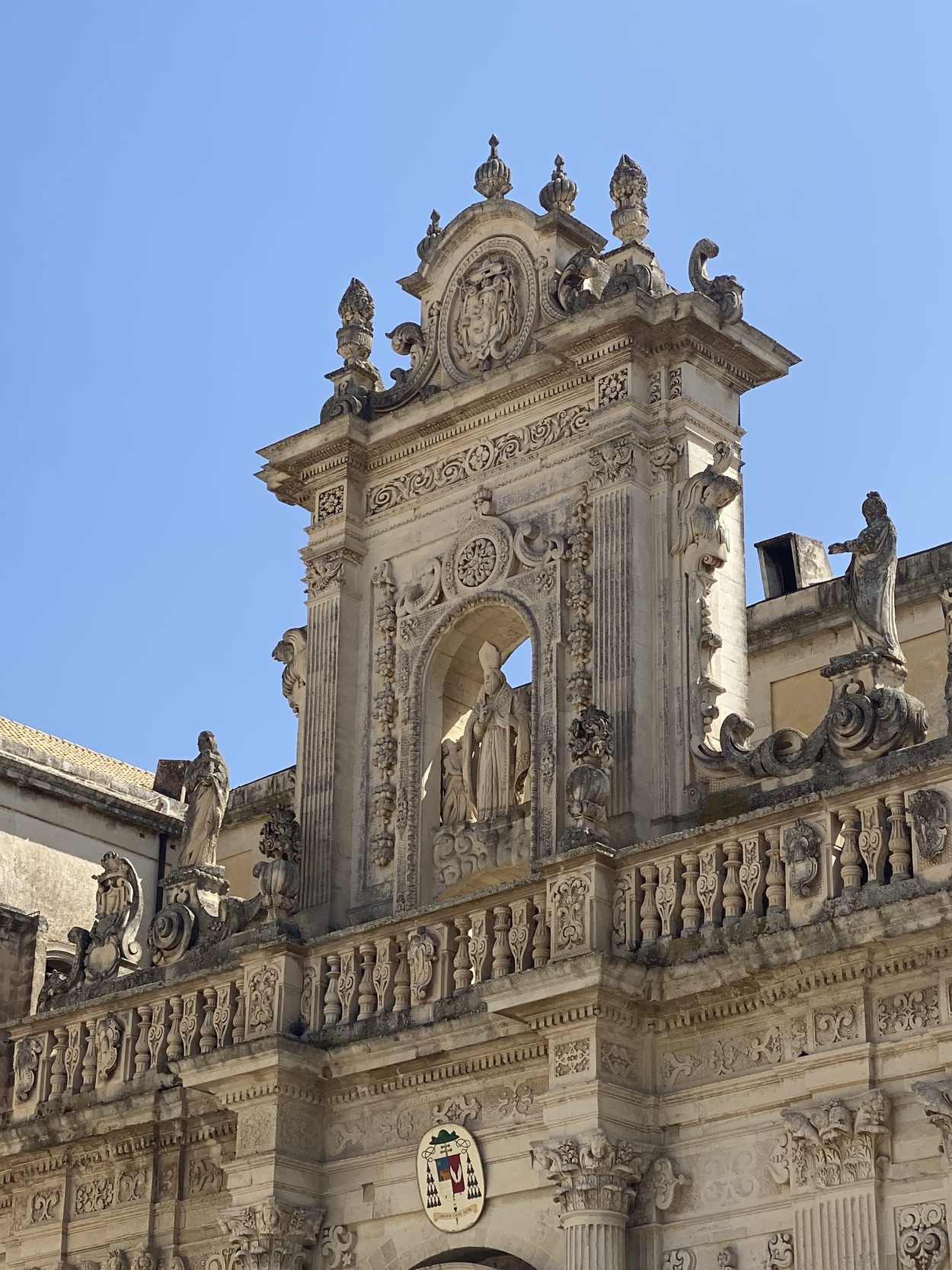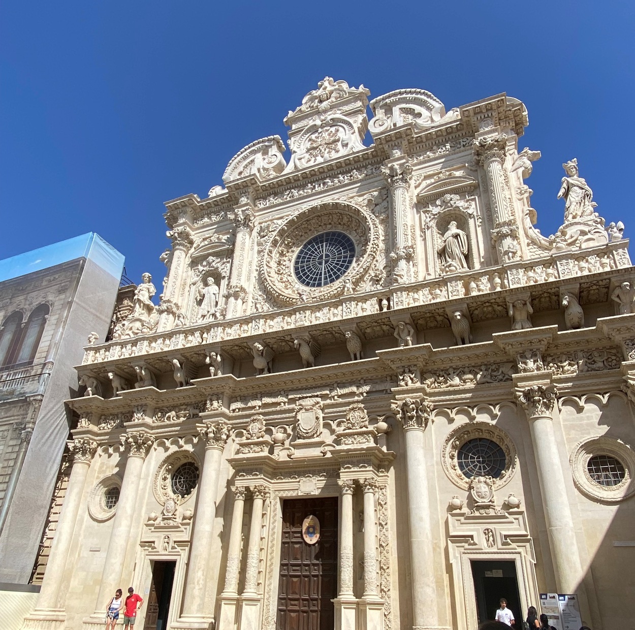 Базилика Санта-Кроче — символ барочного Саленто, воспетый многими. Поль Бурже называл её «декоративной фантазией, граничащей с безумием", чего тут только нет: орлы, драконы, обезьяны, святые, турки, витые колонны, ажурные балюстрады, завитки, цветы, фрукты, развевающиеся ленты...