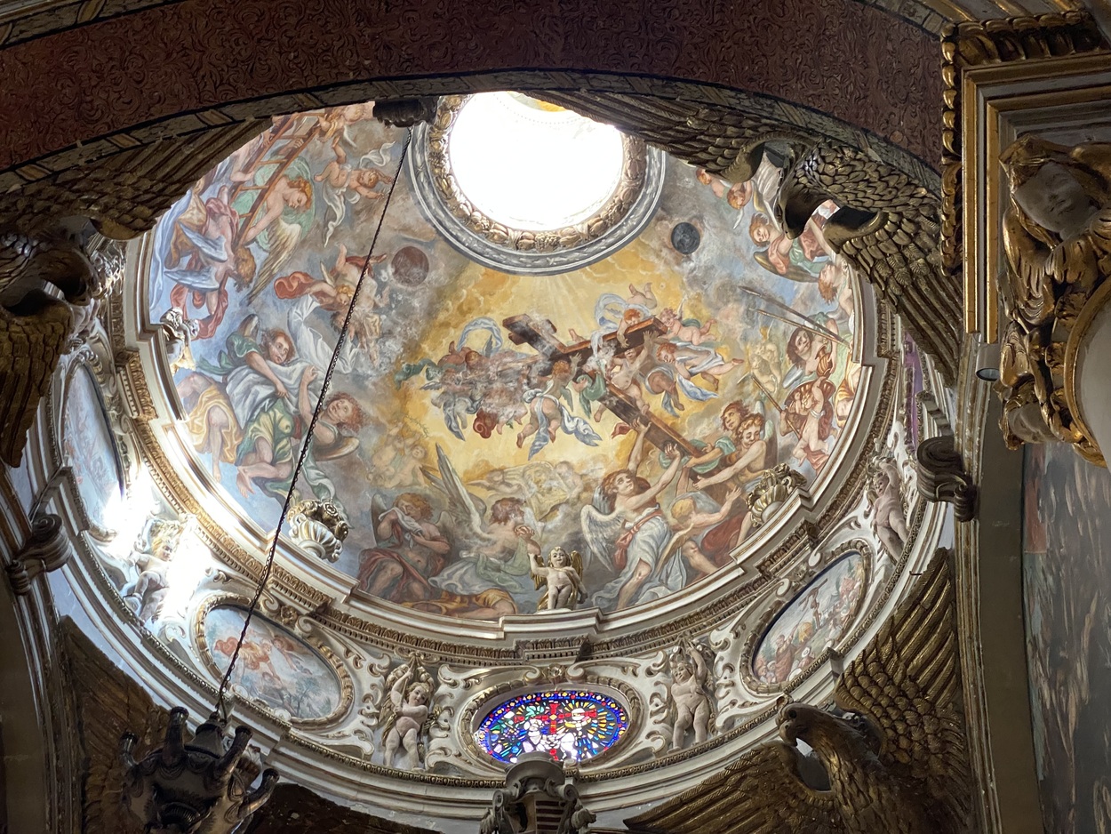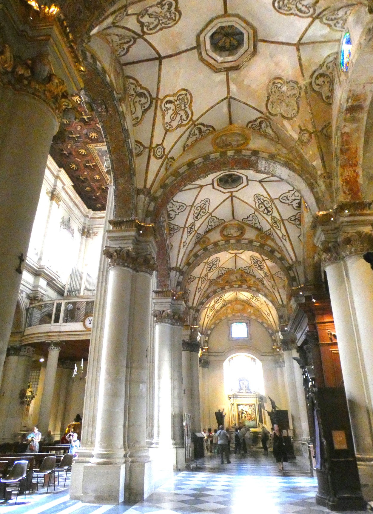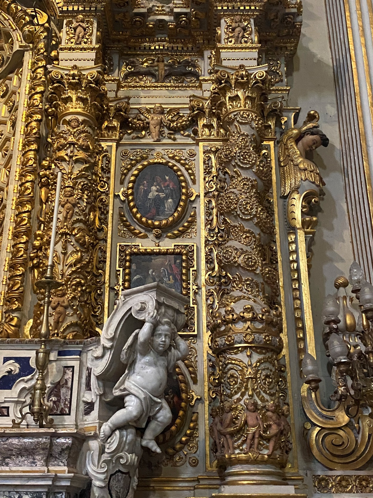 Кроме потолка, внимание привлекают и шесть боковых часовен с позолоченными алтарями.