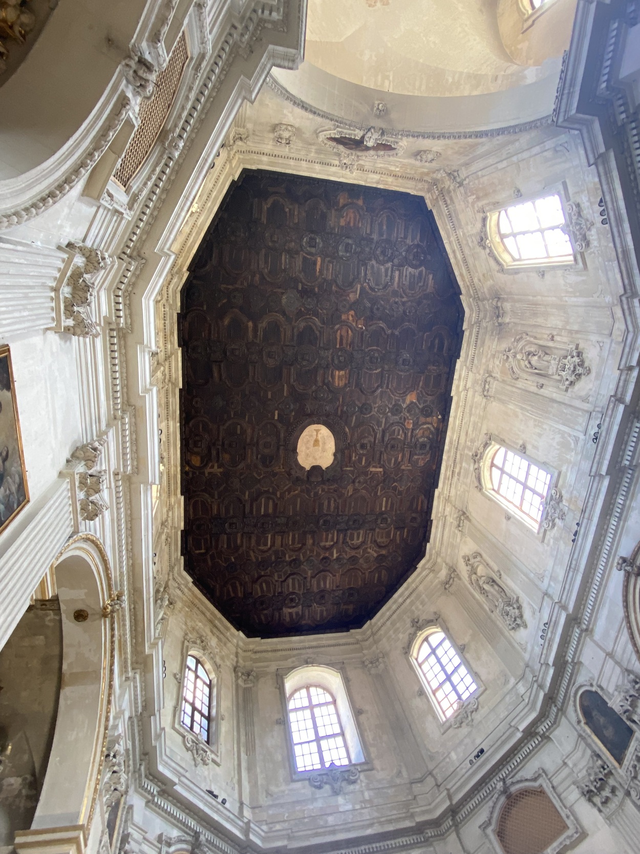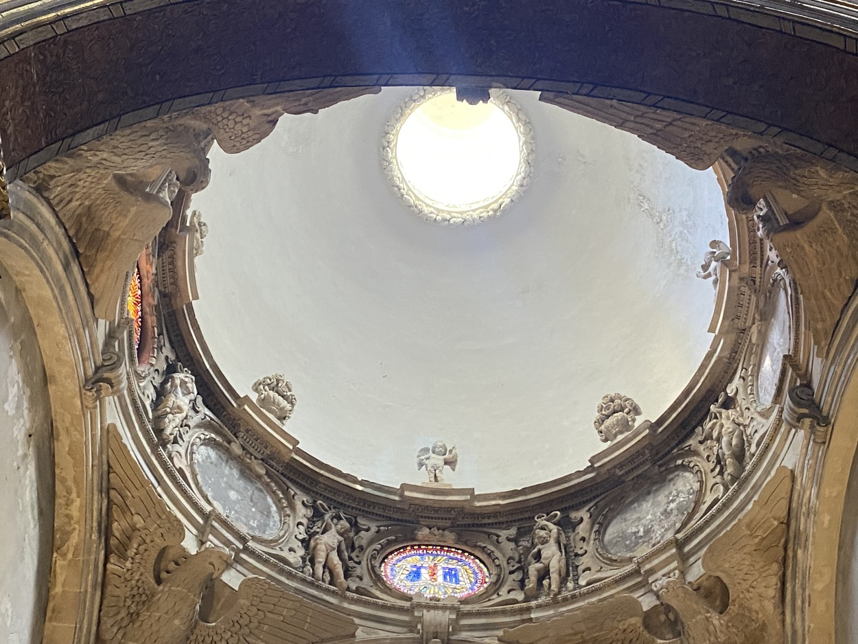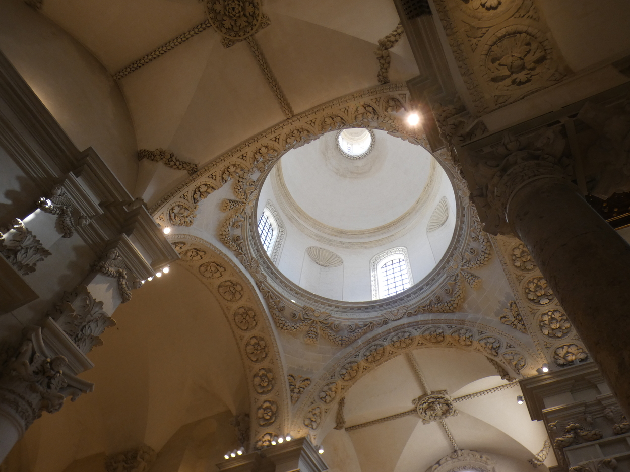 На деревянной раме собрано множество небольших модулей, изготовленных разными мастерскими, которые находились, судя по всему, рядом с церковью. О чем свидетельствует небольшая улица с левой стороны церкви - Via Arte della Cartapesta".С этого-то потолка в 1738 году и началось развитие искусству папье-маше в Лечче.