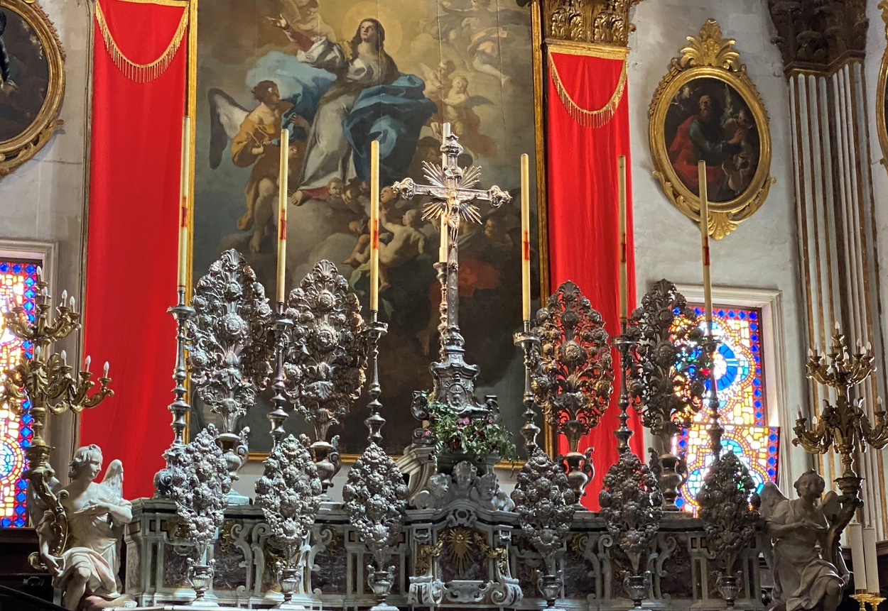 Главный алтарь выполнен из полихромного мрамора, посвящен Распятию Христа. Сопровождается тремя картинами местного художника XVIII века Оронцо Тисо: "Жертвоприношение Ноя после потопа", "Успение Богородицы", "Пророк Илия и жрецы Ваала".