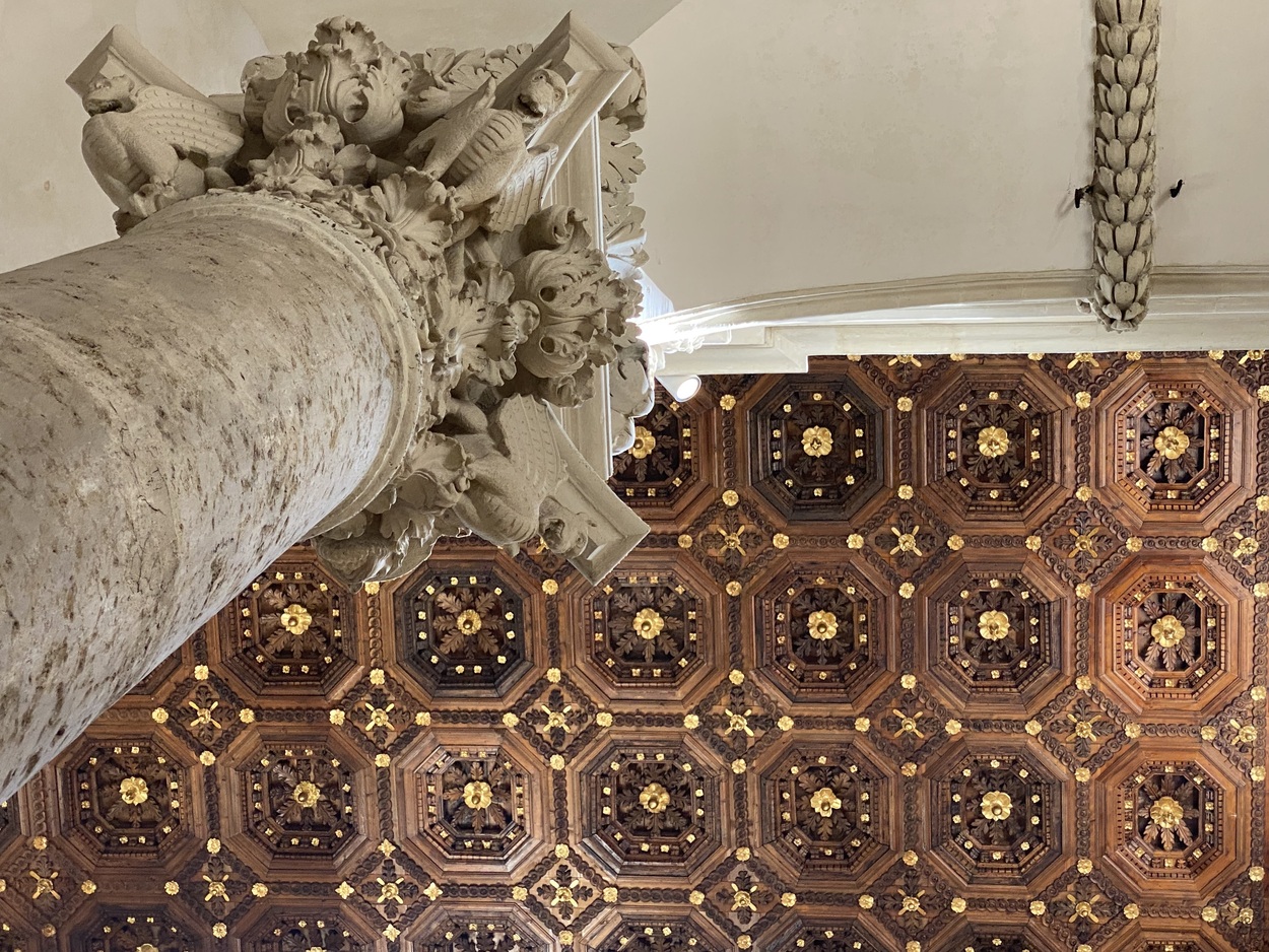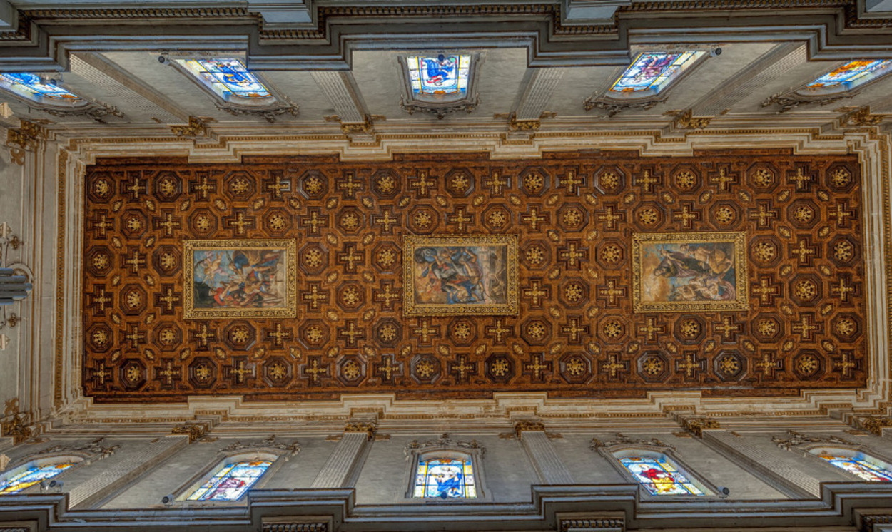 Деревянный потолок с позолоченными кессонами покрывает весь центральный неф.