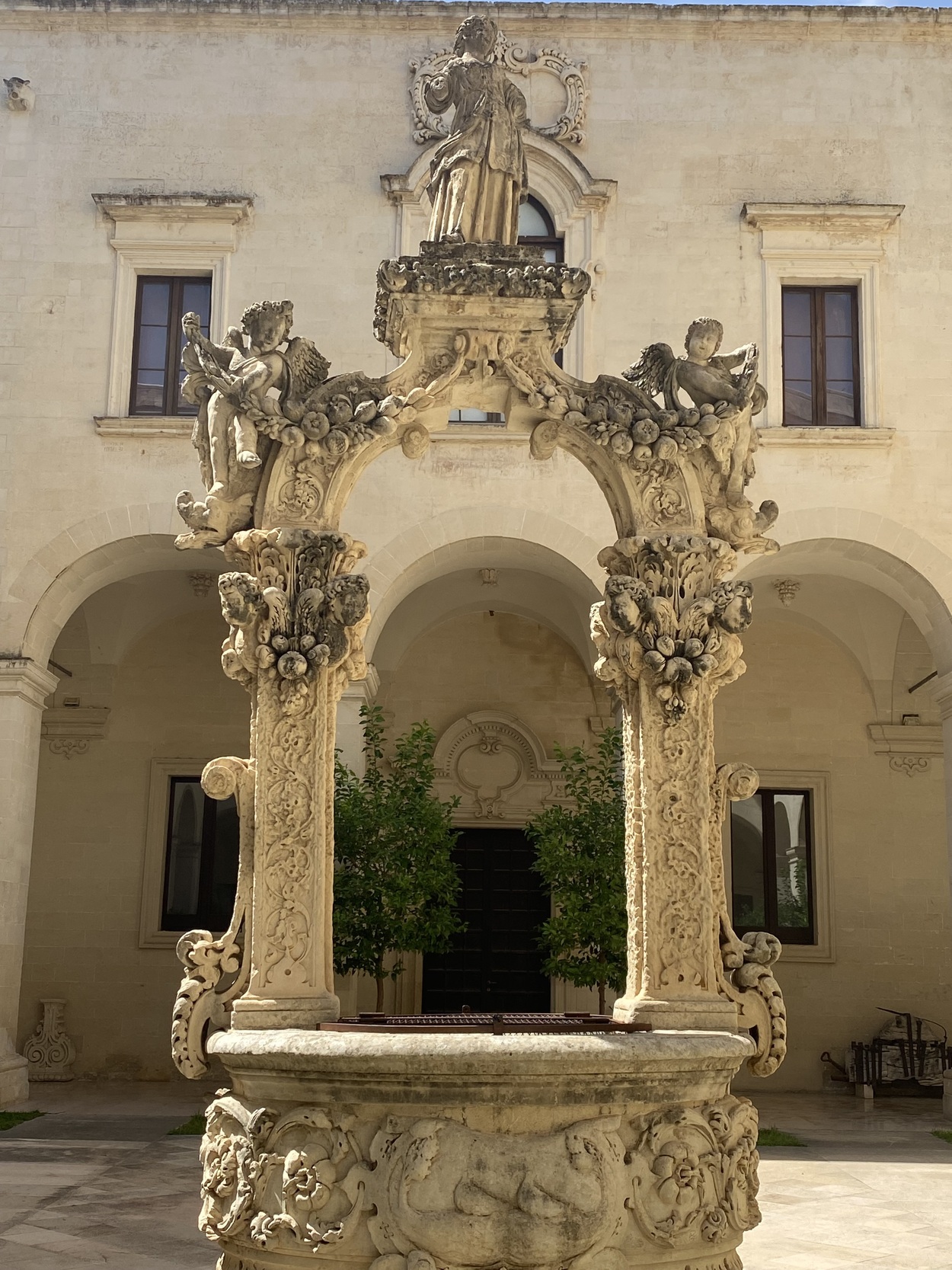 Гуляя по залам музея, можно заглянуть и в симпатичный атриум - внутренний двор, в центре которого изящный колодец работы Чино, с типичным барочным декором: фигурами морских животных, цветами, гроздьями гранатов, листьями аканта, херувимами и ангелочками. Над аркой колодца - статуя Святой Ирины - более ранней покровительницы города, чем св. Оренцо.