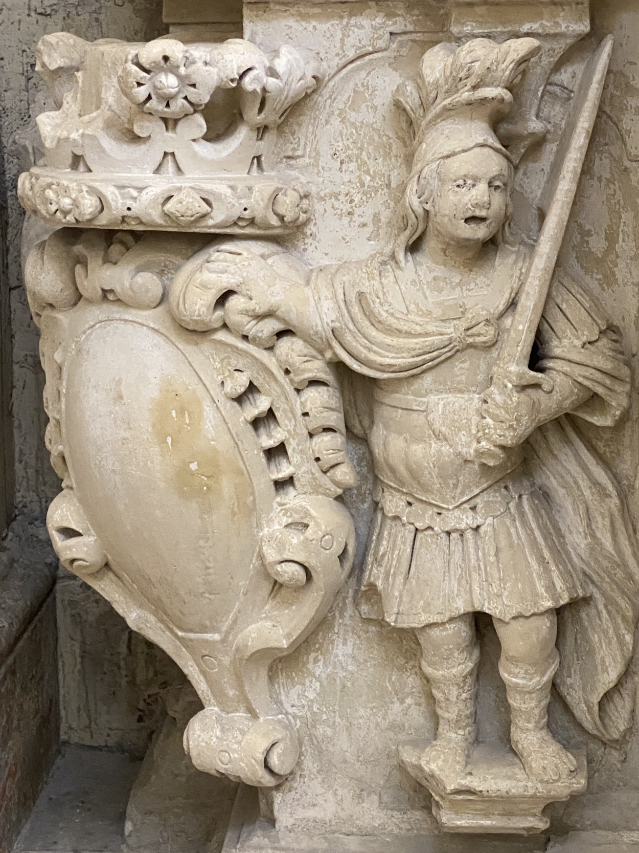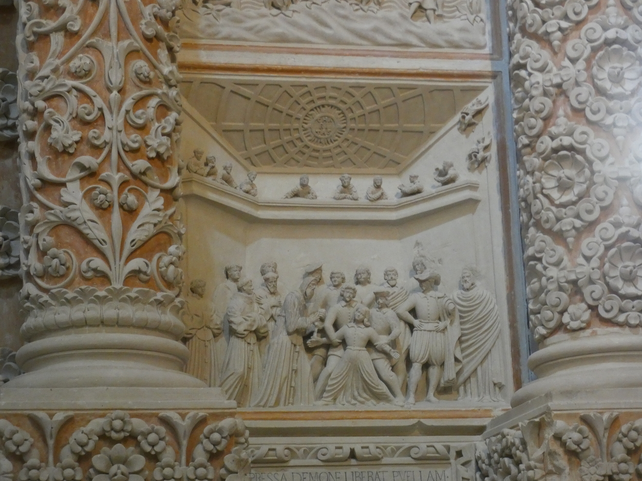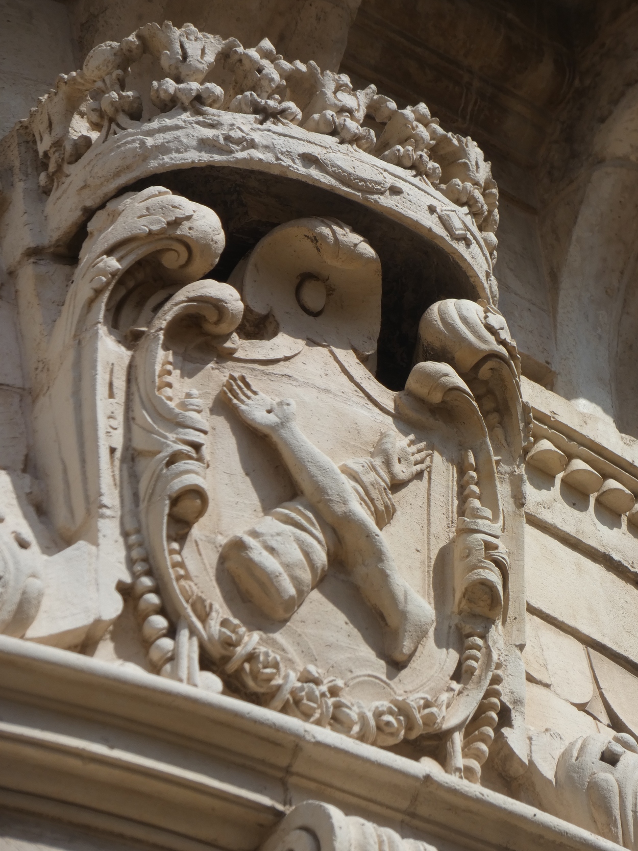 На самом верху в тимпане изображение креста во славе (т.к. в храме хранятся какие-то реликвии от св. Креста). В нишах статуи Святого Бенедикта (справа) и Святого Целестина (слева) - основателя ордена, которому принадлежали церковь и монастырь, а также аллегорические женские фигуры - Стойкость и Вера.