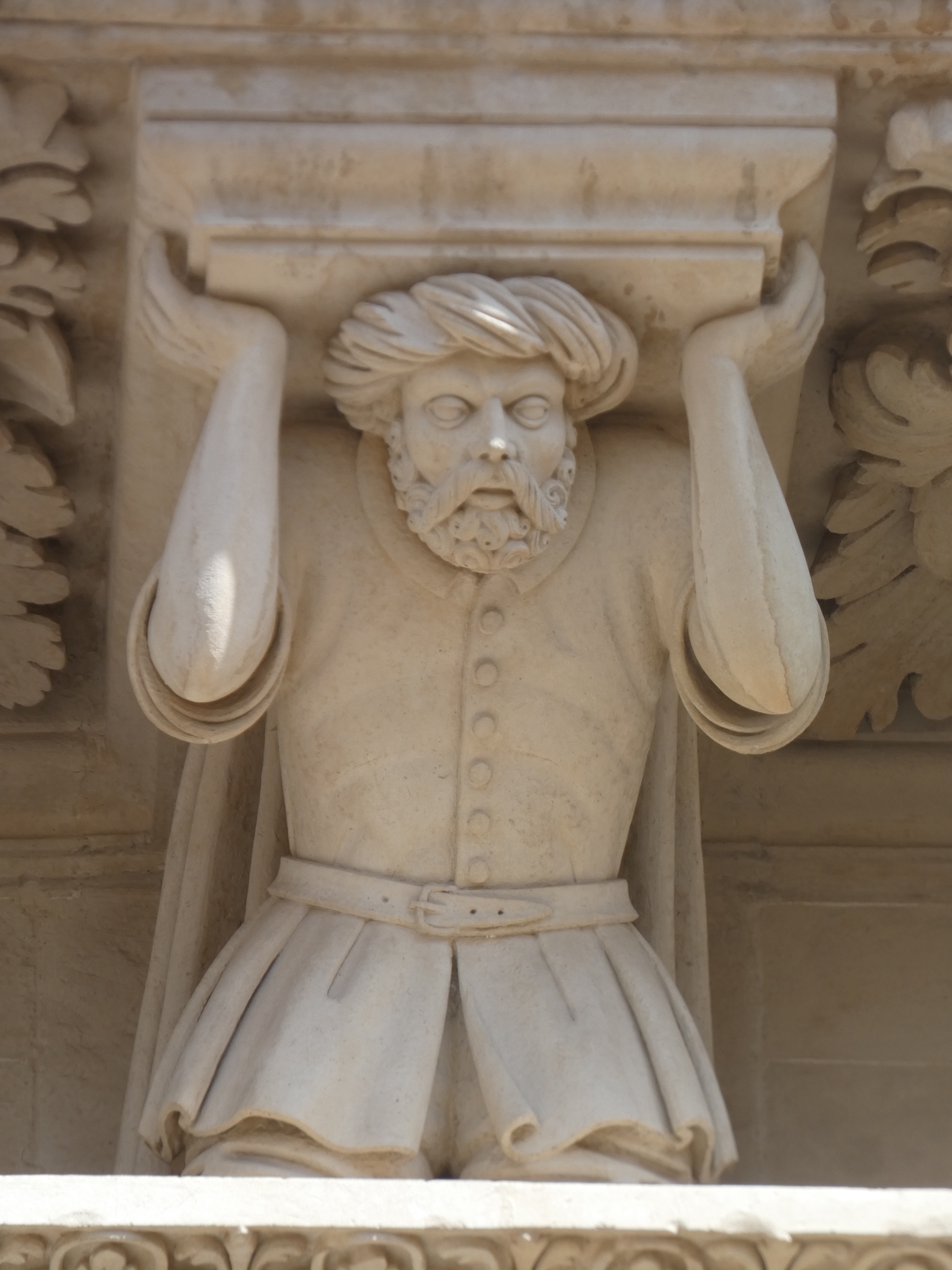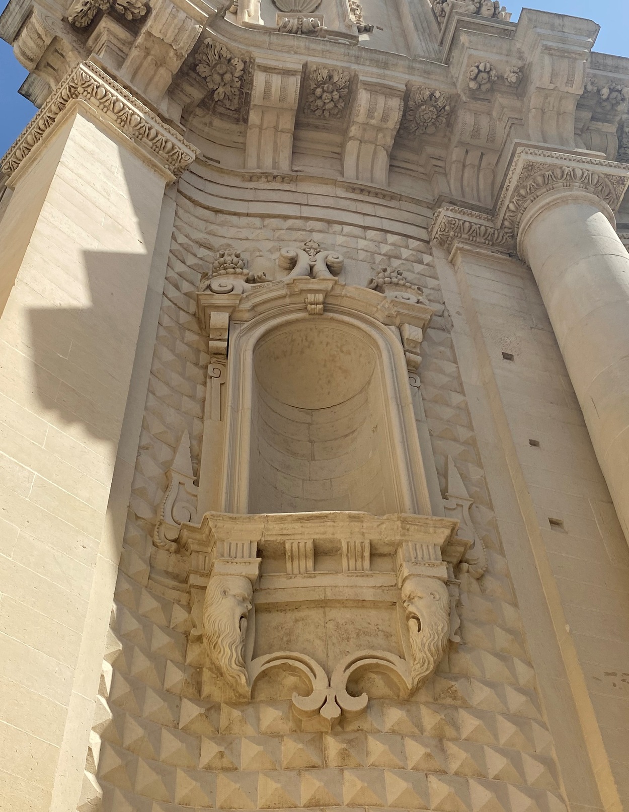 Все здания города построены из местного камня, называемого "леччизу" или "пьетра леччезе". Это особый вид известняка желтоватого цвета, очень мягкий и легко обрабатываемый - руки скульптора сами просятся вырезать из него все, что в голову придет. А идей у скульпторов Лечче было не занимать. В лучах солнца камень словно начинает светиться, поэтому особое волшебство возникает на улицах города ранним утром или на закате. Мы гуляли не в это время, но Лечче все равно остался в памяти как город медового цвета.