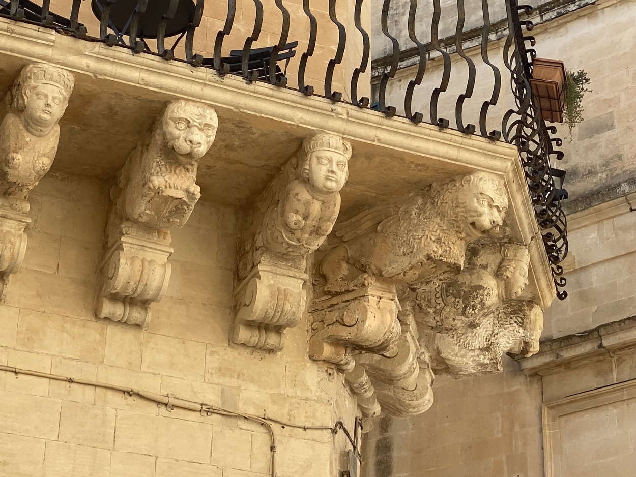 Балкон поддерживается тринадцатью разными теламонами (буквально - "носителями"), опирающимися на антаблемент; среди них люди, животные, птицы и мифические создания. Здесь можно видеть, в частности, капитолийскую волчицу, грифона Генуэзской республики, дракона семьи Боргезе, арагонского воина, османского пленника, захваченного в битве при Лепанто. На балюстраде балкона стоят тринадцать разнообразных фигурок путти, в руках которых символы светской и духовной власти — короны и тиары.