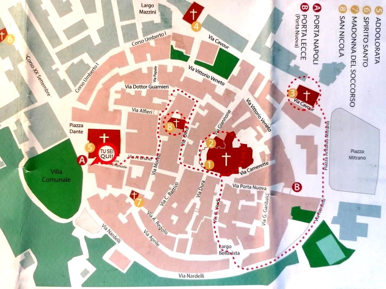 Церковь Святого Духа (chiesa dello Spirito Santo) спряталась среди современных домов на corso XX Settembre. О названии храма сообщает надпись на фасаде "Ecclesia Spirìtas Sancti"(1683). При строительстве использованы традиционные для Апулии каменные пластины из известняка кьянкарелле» (chiancarelle).