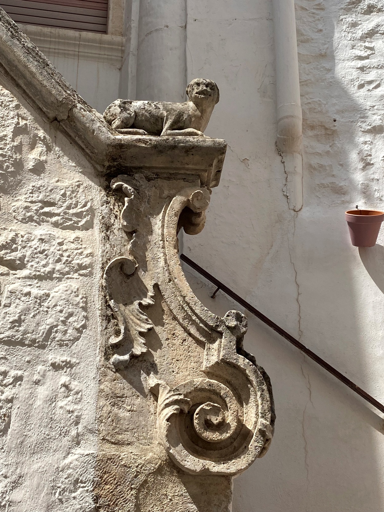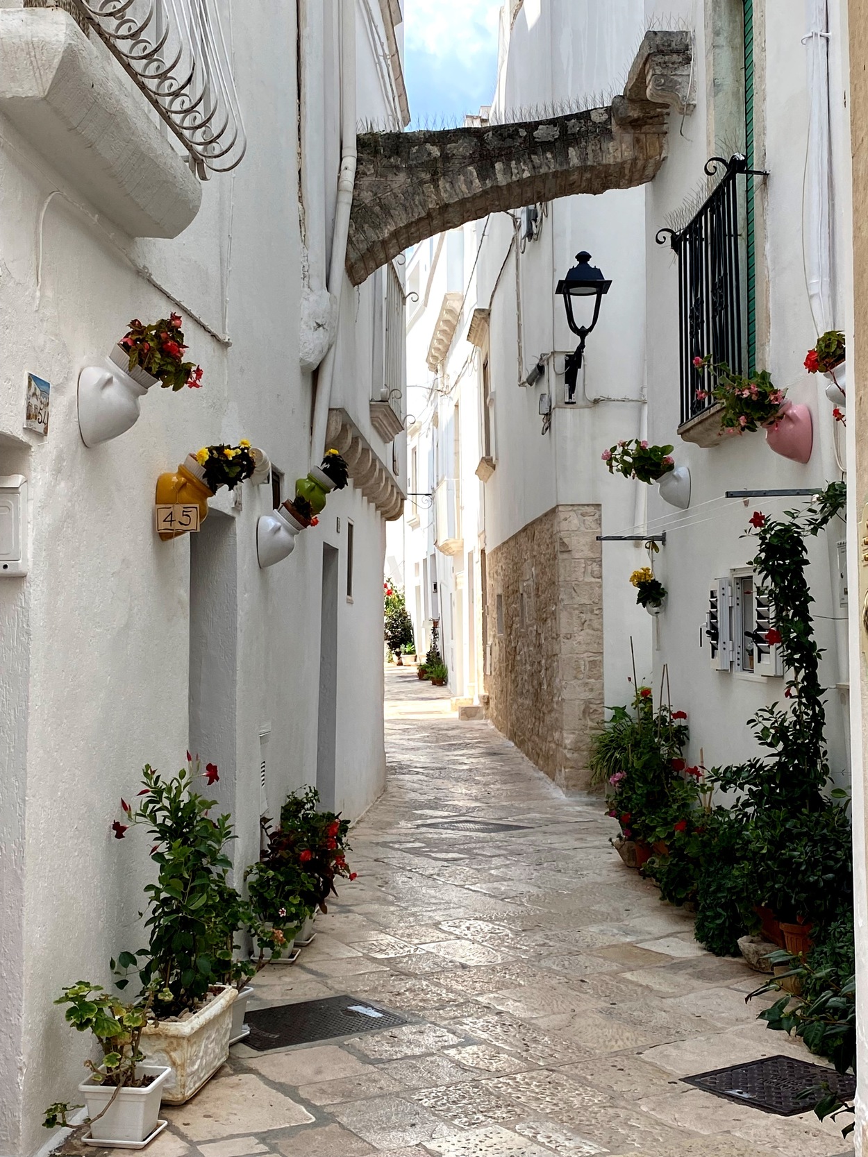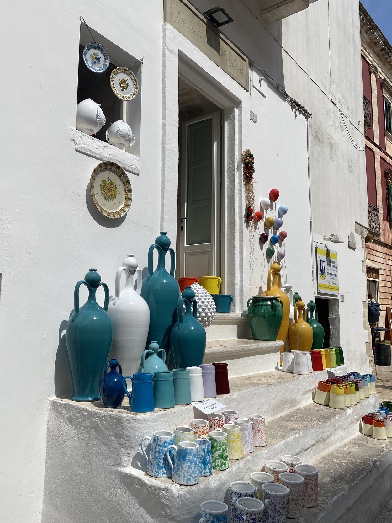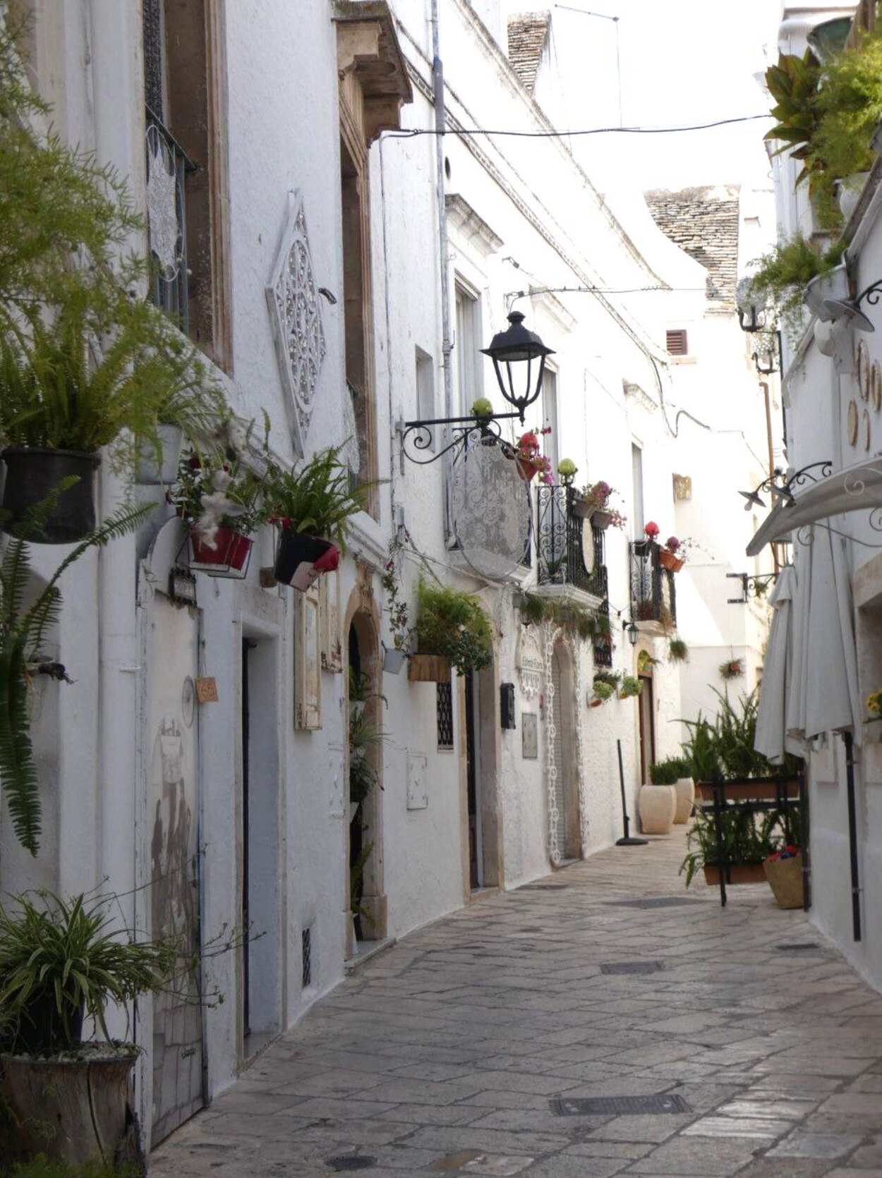 Особенно распространены сорта "Вердека" и "Бьянко д'Алессано", из которых тут делают великолепное белое вино Locorotondo DOC. Именно его предлагается попробовать в уличных ресторанчиках. Похоже, что, когда мы вышли на прогулку, как раз дегустацией вина и местной кухни и были заняты все туристы города - время-то обеденное: храмы закрыты, улицы пустынны.
