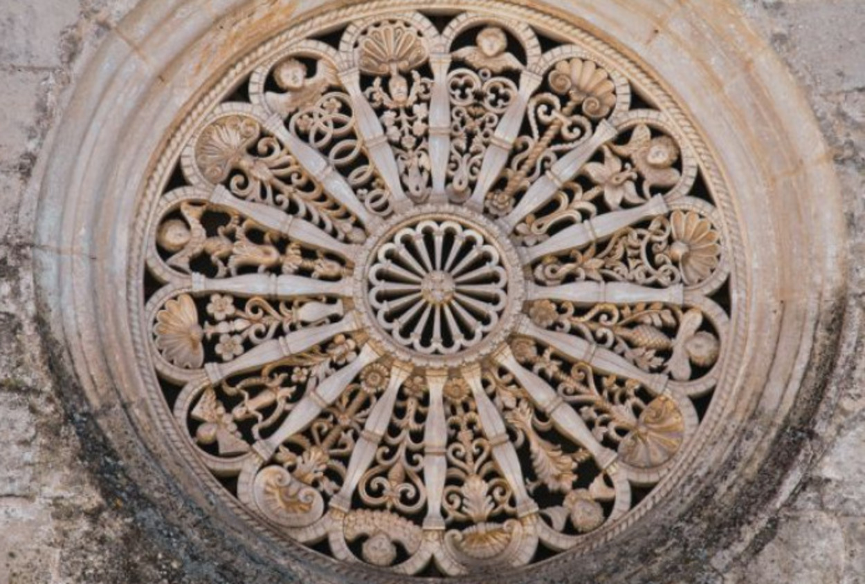 Фасад сохранил средневековый облик, на широкой пустой стене большое окно-роза с каменным кружевом резьбы.