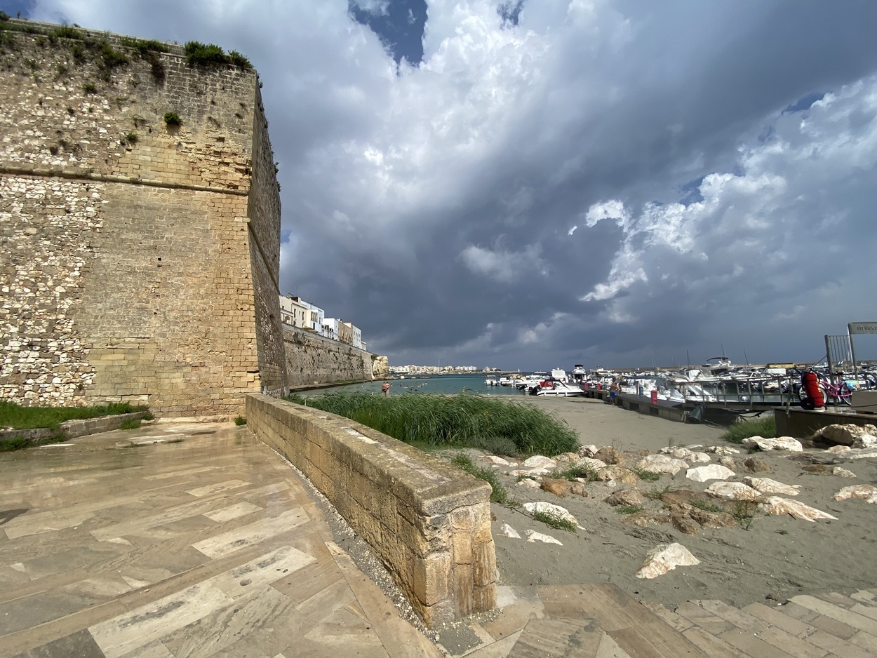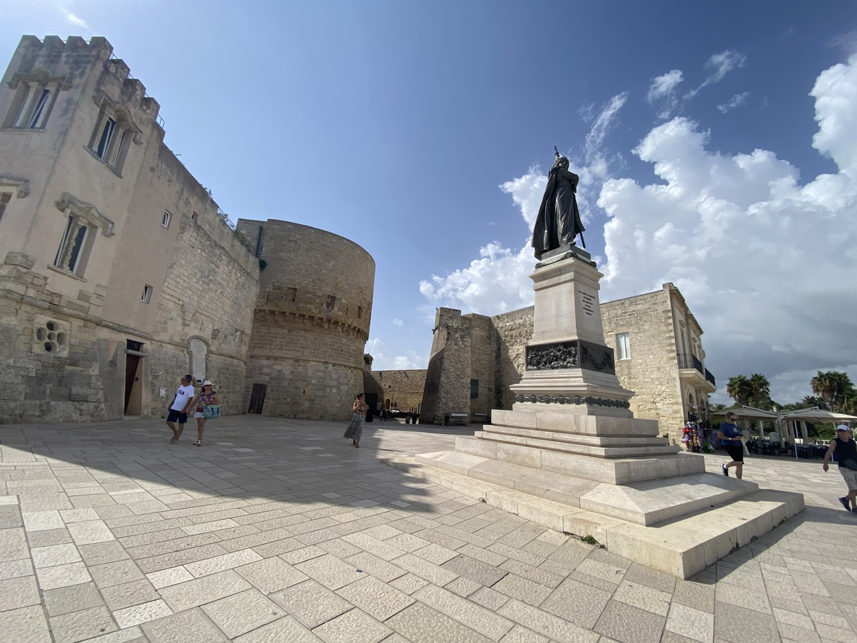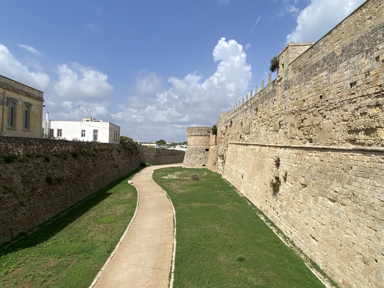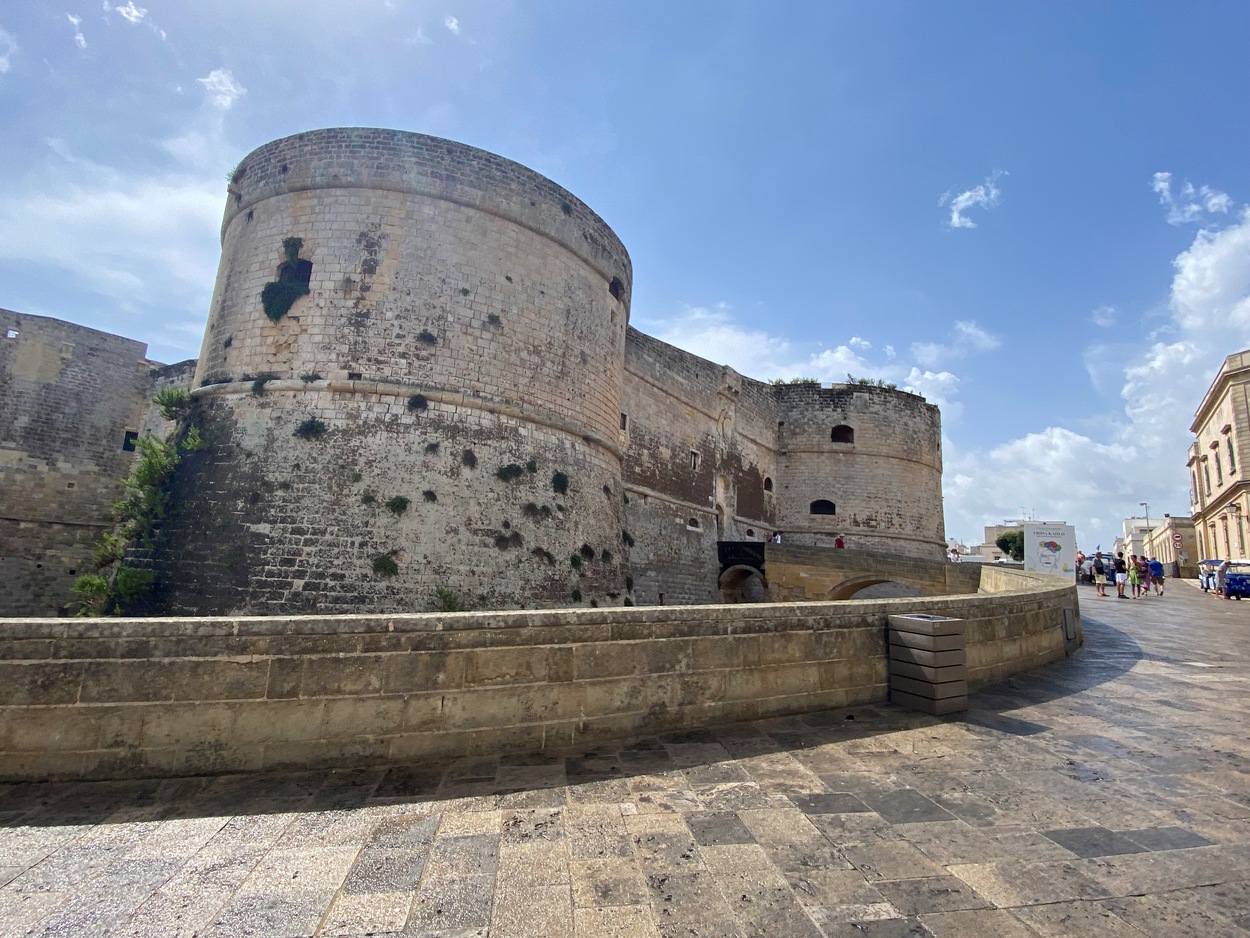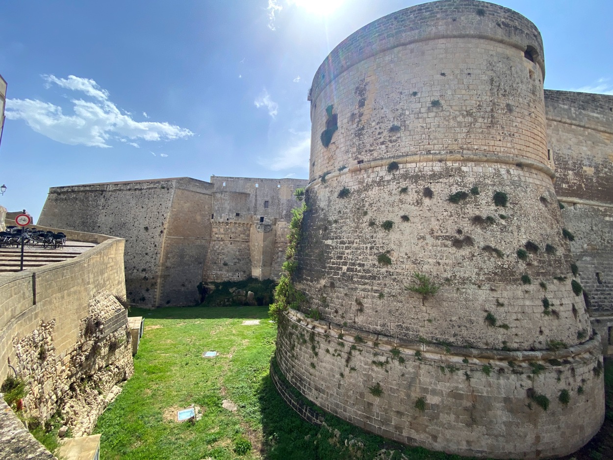 Внутрь городских стен можно зайти через Porta Terra, а можно и с набережной, от памятника в честь 800-мучеников Отранто, которые погибли в 1480 году от рук османов (Monumento agli Eroi e ai Martiri Otrantini del 1480). В 2013 году они были канонизированы, а в 1980 году к 500-летию этого печально события была установлена мемориальная доска.