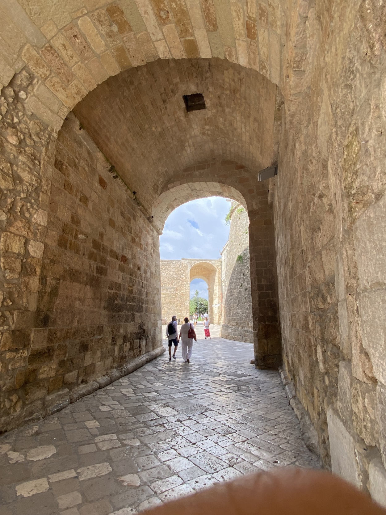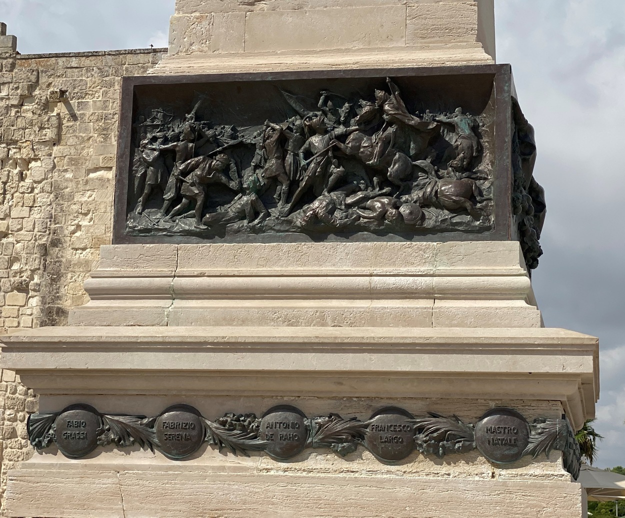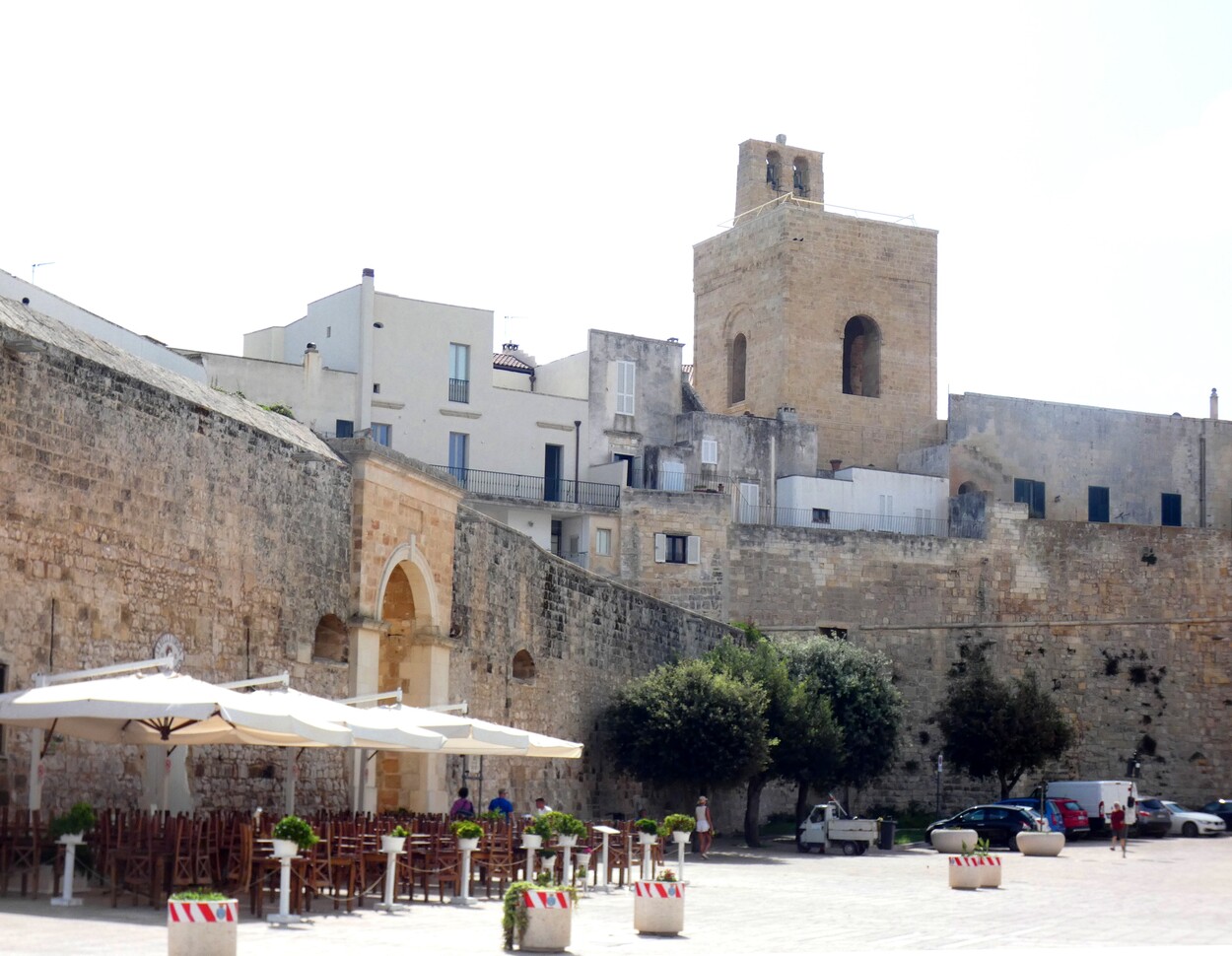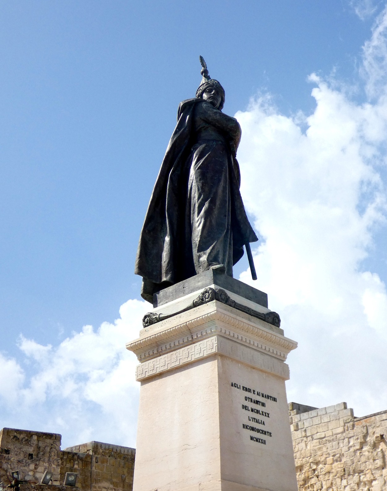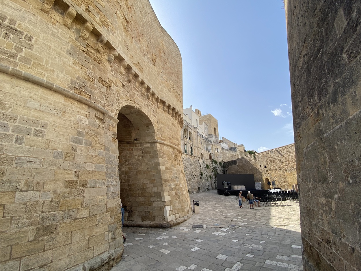 Внутрь городских стен можно зайти через Porta Terra, а можно и с набережной, от памятника в честь 800-мучеников Отранто, которые погибли в 1480 году от рук османов (Monumento agli Eroi e ai Martiri Otrantini del 1480). В 2013 году они были канонизированы, а в 1980 году к 500-летию этого печально события была установлена мемориальная доска.