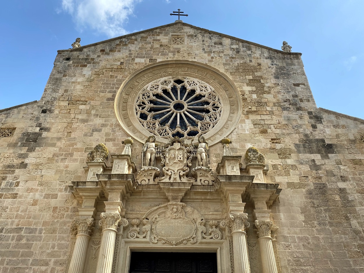 Великолепное розовое окно относится к тому же периоду, что и боковой портал, а сложносочиненный козырек над входом напоминает о барокко Лечче.