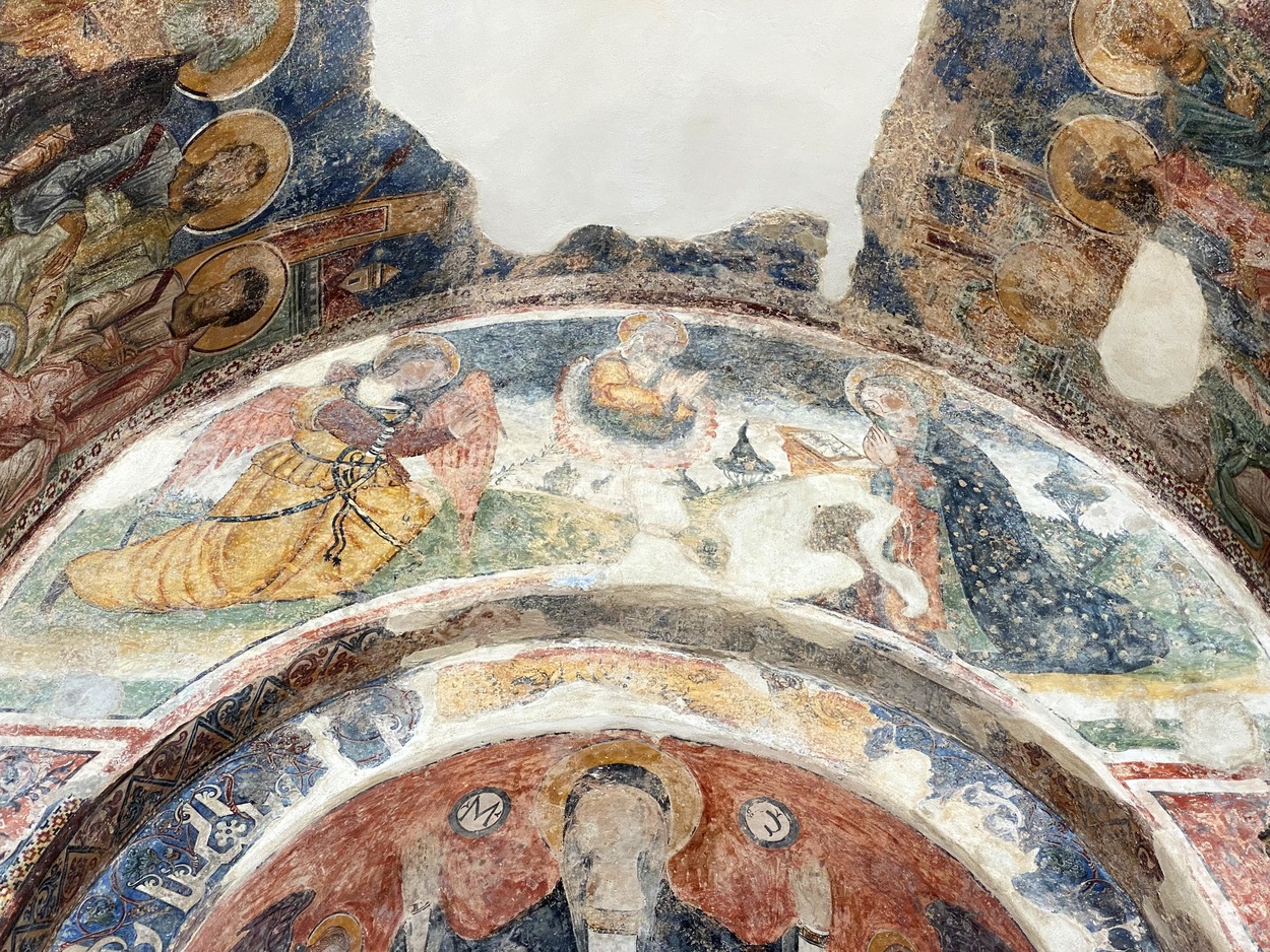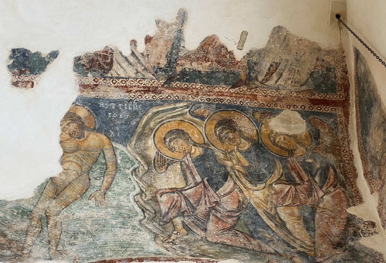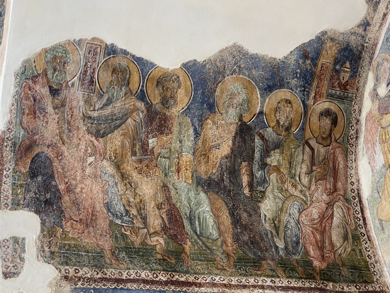 Реставрация фресок подтвердила, что сцены "Рождества", "Пятидесятницы", "Воскресения" и один из евангелистов в парусах были созданы столичным художником около 1300 года. Фрески "Апостолы и Мадонна с младенцем со св. Николаем и св.Антонием".