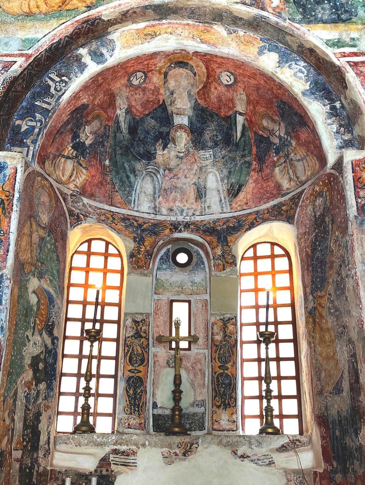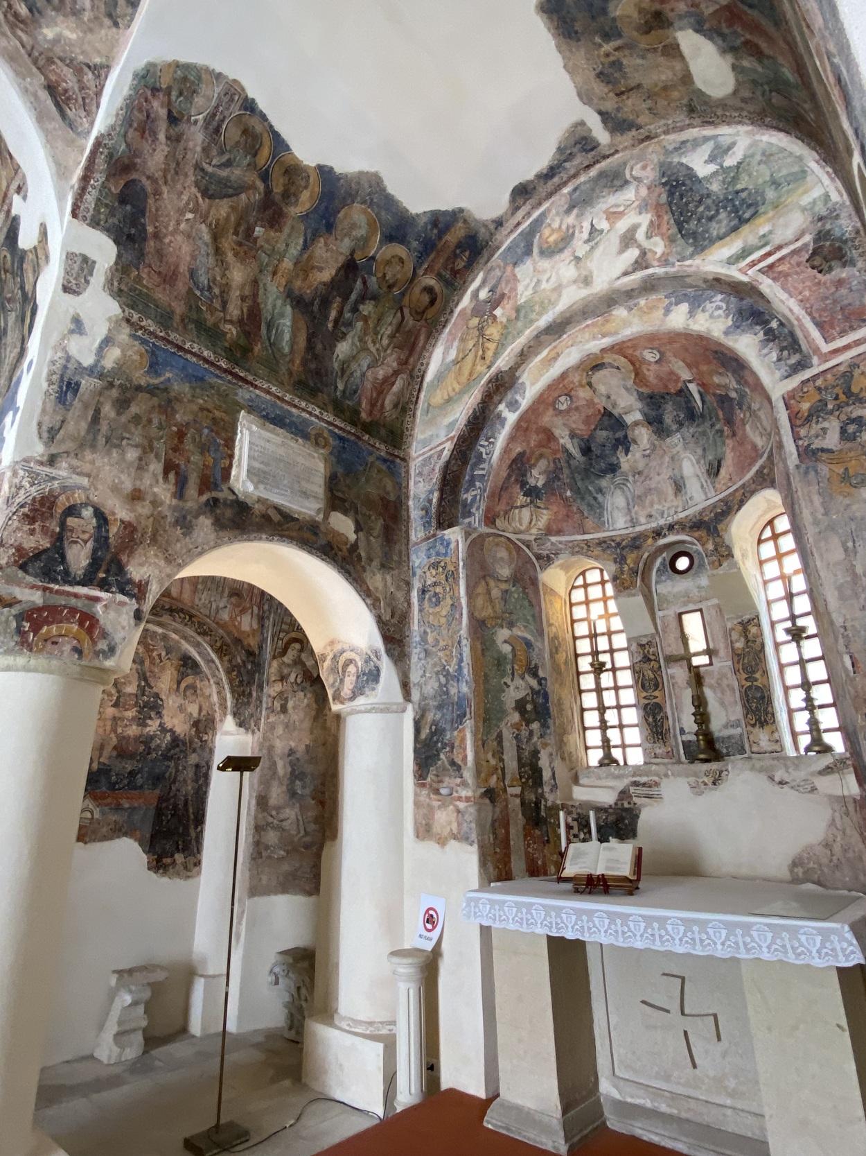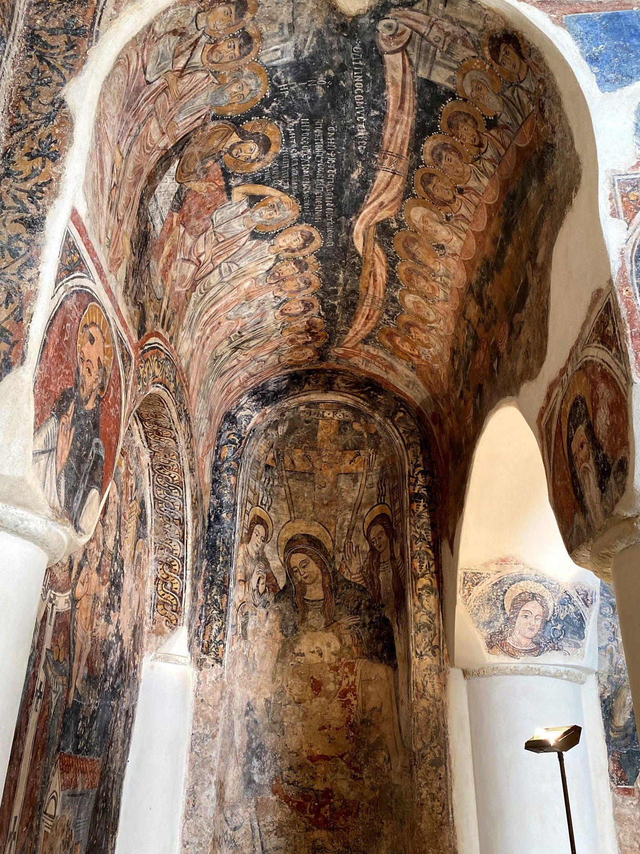 Реставрация фресок подтвердила, что сцены "Рождества", "Пятидесятницы", "Воскресения" и один из евангелистов в парусах были созданы столичным художником около 1300 года. Фрески "Апостолы и Мадонна с младенцем со св. Николаем и св.Антонием".
