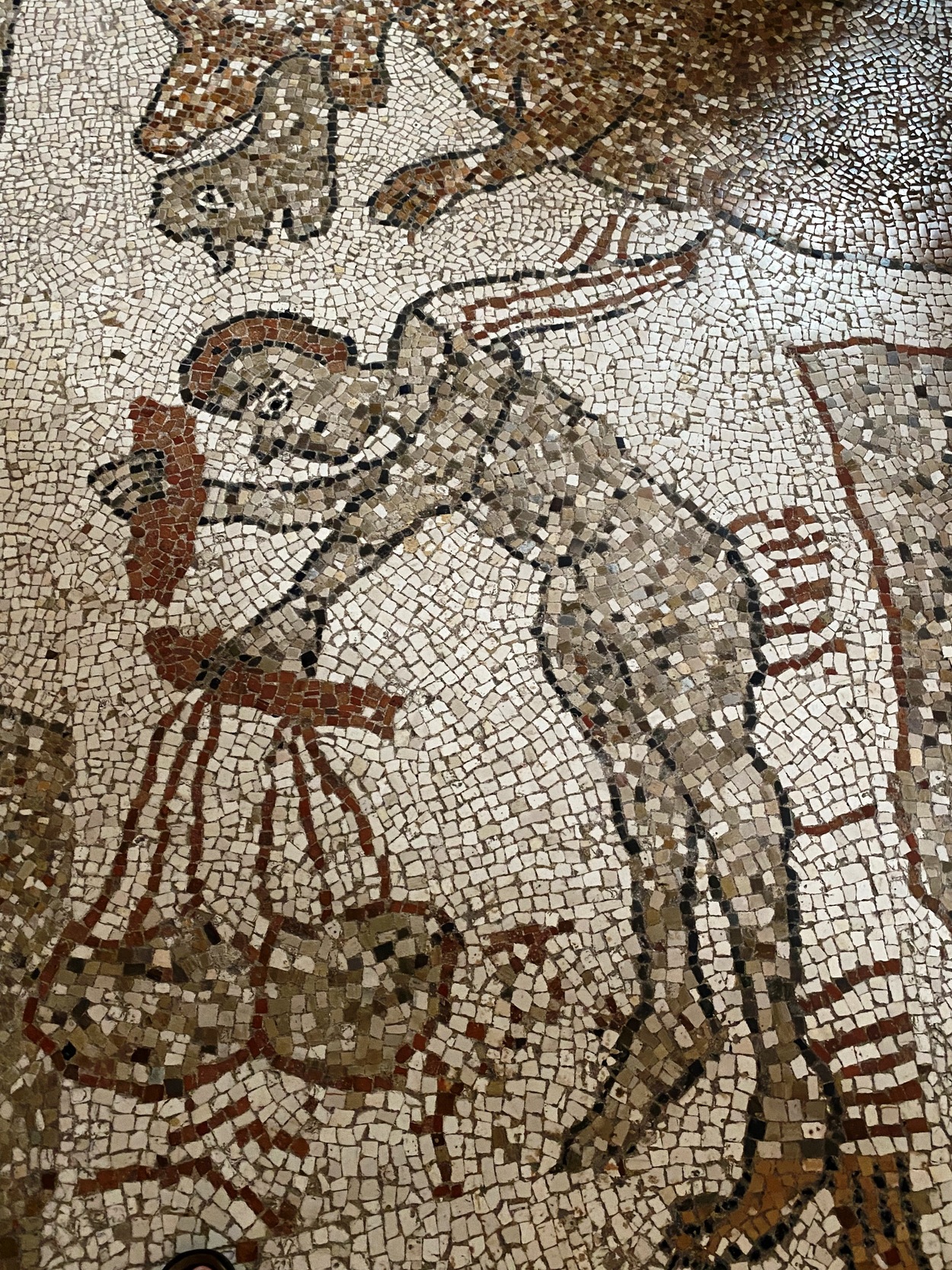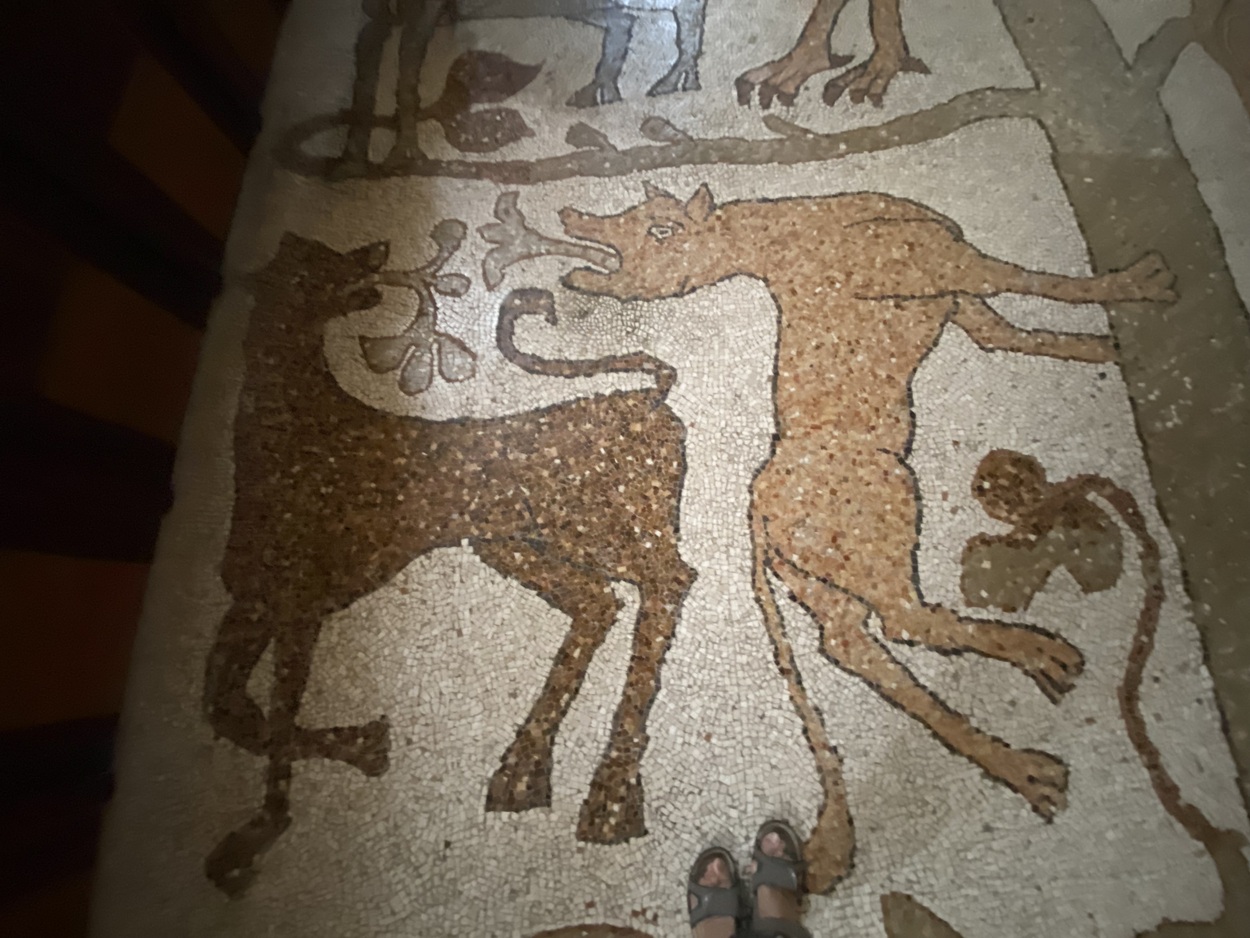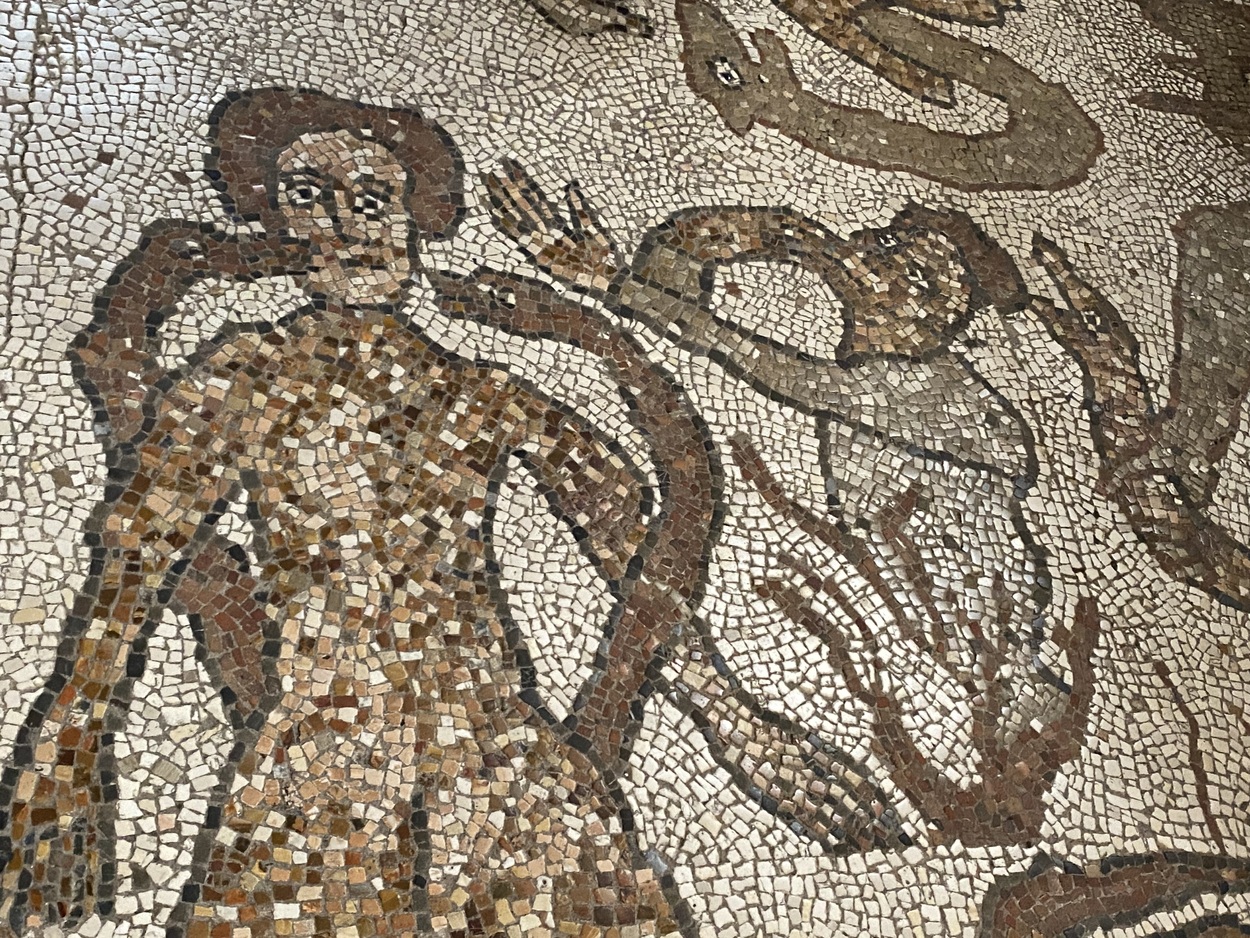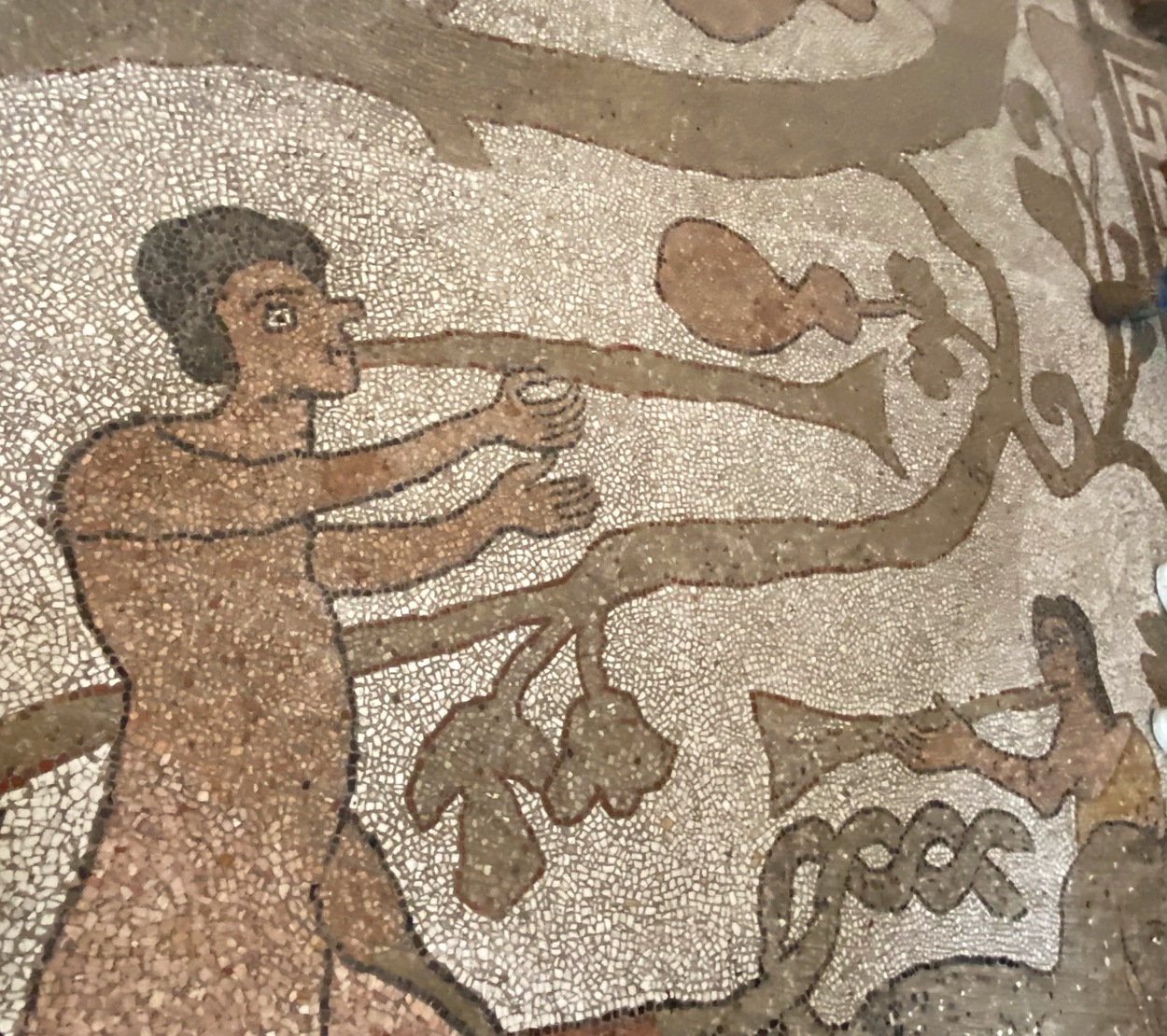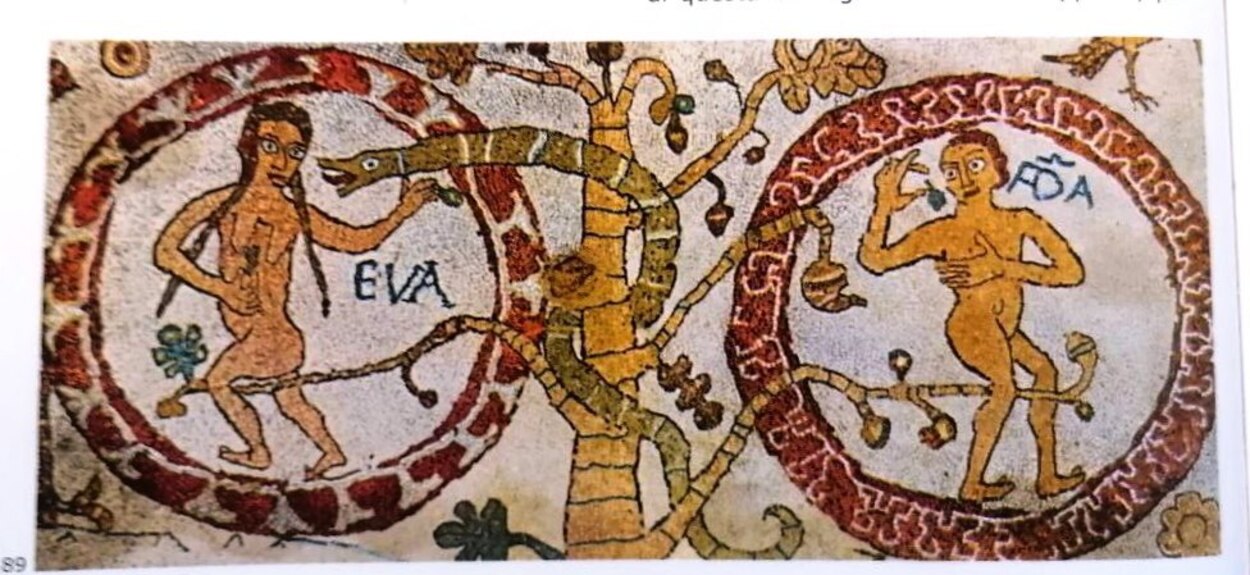 Завершается большое «древо» сценой грехопадения Адама и Евы, размещённой на вершине лиственной кроны. Первородный грех концептуально связан с изображением слонов в начале мозаики: такой параллелизм указывает на цикличность истории и, одновременно, — на надежду искупления и спасения.