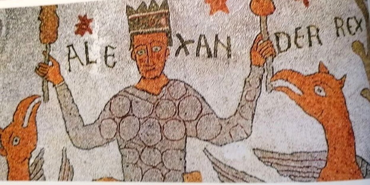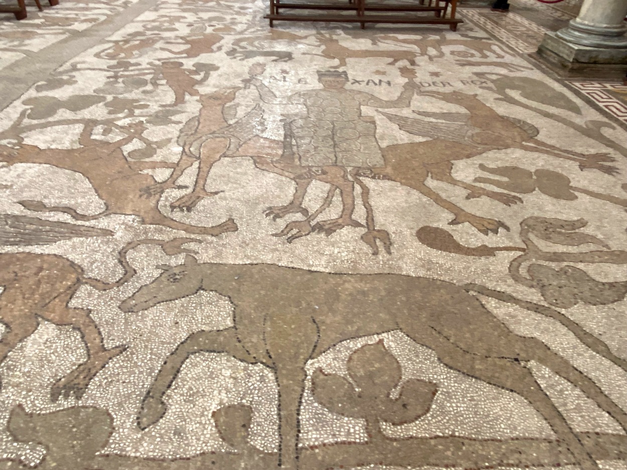 Во всей мозаике Отранто заметно присутствие светского (или, как его еще называют, профанного) мира: широко используются сюжеты не библейского репертуара и некоторые образы даже имеют, возможно, актуальный на тот момент политический подтекст. Примером этому служит сцена вознесения Александра.