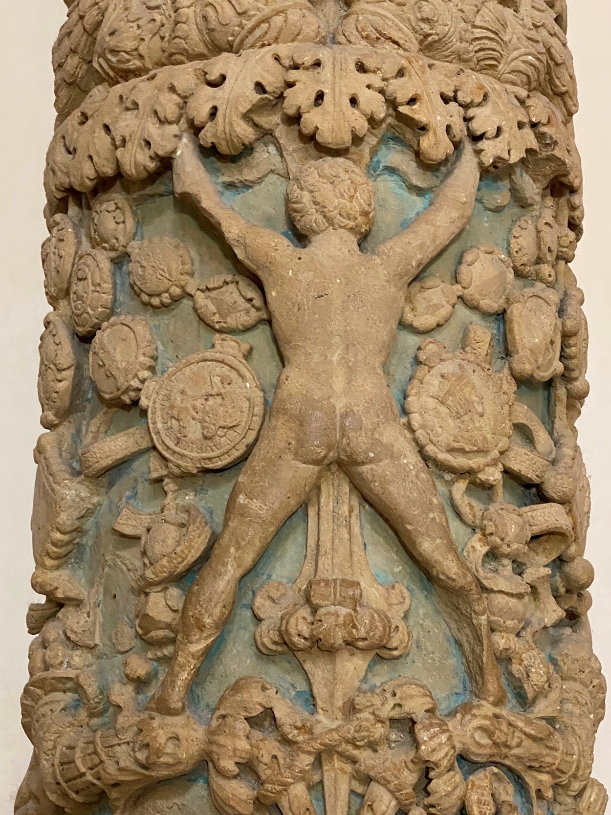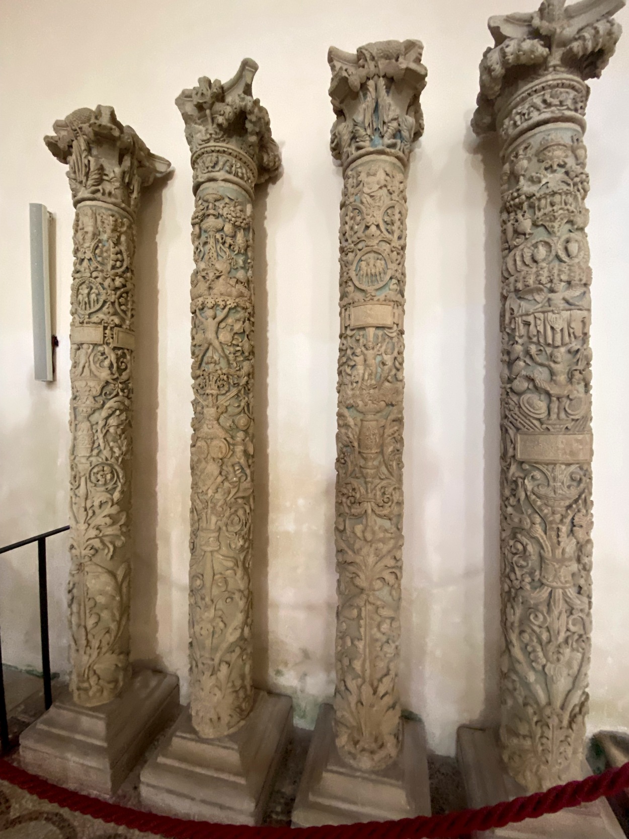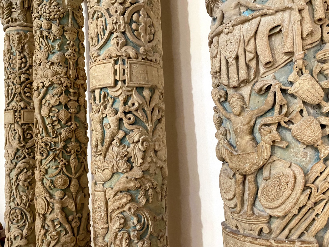 Рядом установлены четыре резные колонны XVI века — фрагменты древнего алтаря. На одной из них — надпись с именем мастера и датой: opus Gabriellis Riccardi Licini, 1524.