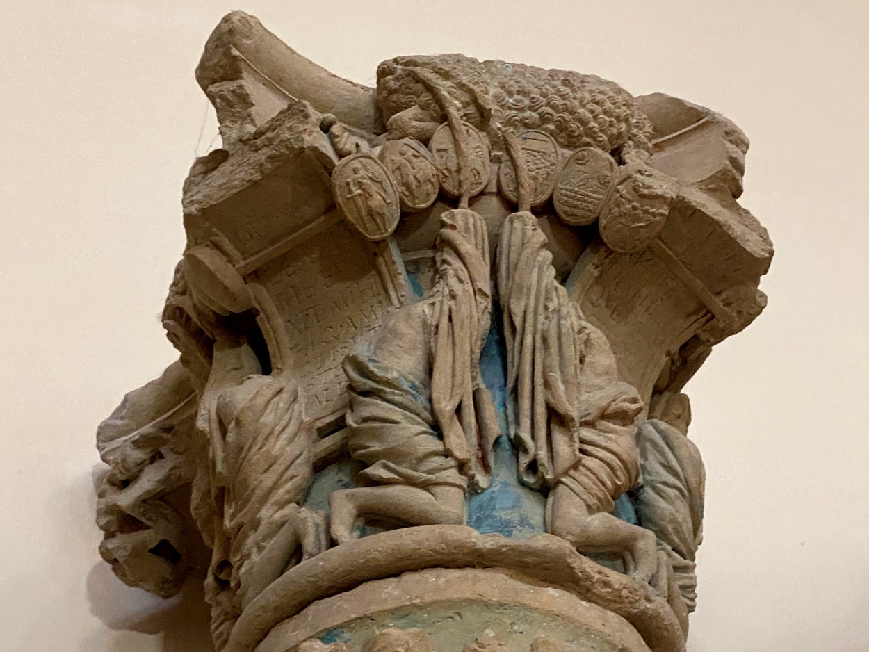 Многие из них - сполии (вторично использованные капители) позднеантичного, византийского и раннесредневекового происхождения. Можно увидеть редкие лигурийские капители с изображениями грифонов или гарпий (если идти по направлению к главному алтарю).