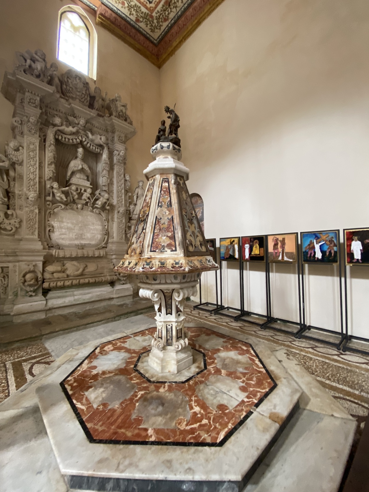 В конце нефа, у контрфасада, установлен барочный надгробный памятник архиепископа Ф.М.Де Асте (1720) и архиепископа Гаэтано Коссо. Рядом — мраморная крестильная купель XVIII века.