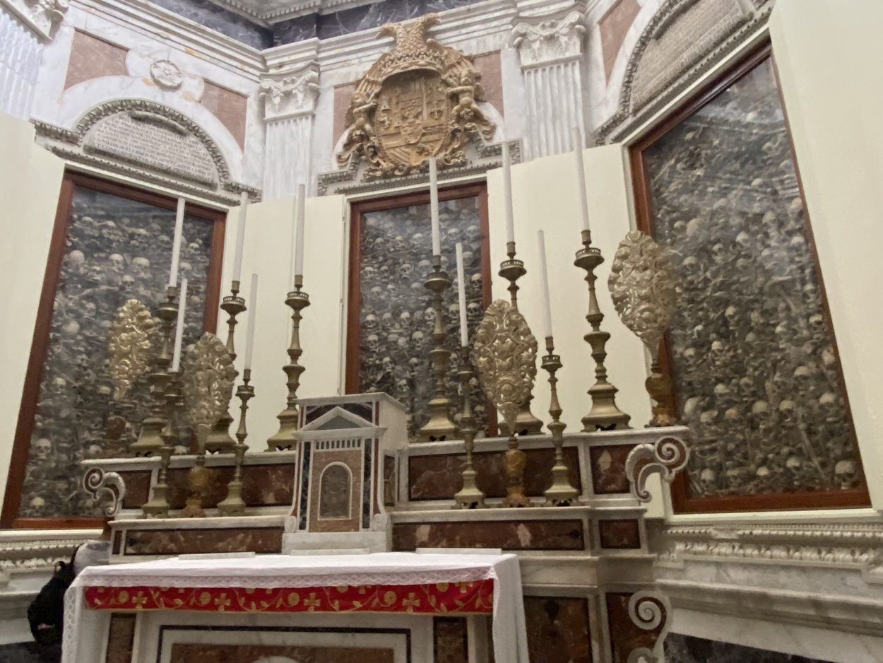 Изучив напольную мозаику, можем теперь посмотреть интерьер храма. Стены собора, к сожалению,"голые" - результат многочисленных переделок и реконструкций, которые исказили интерьер храма. Но по периметру расположен ряд алтарей и гробниц.