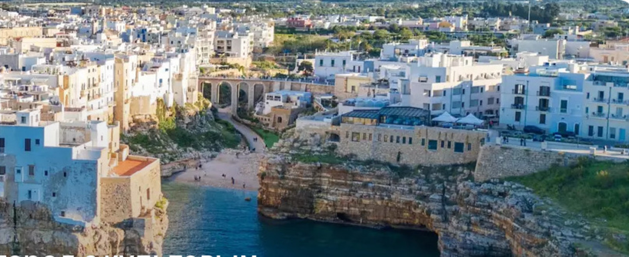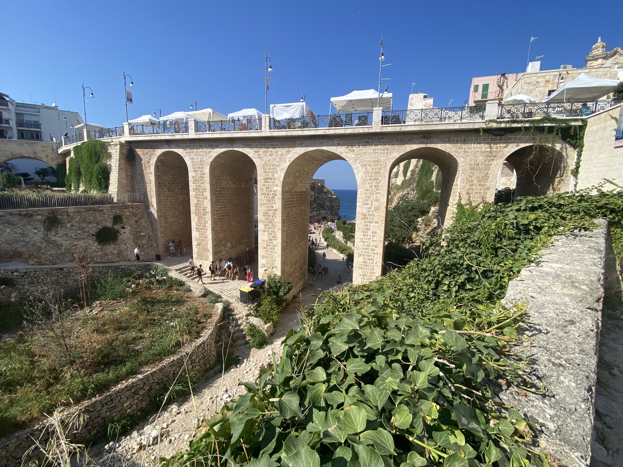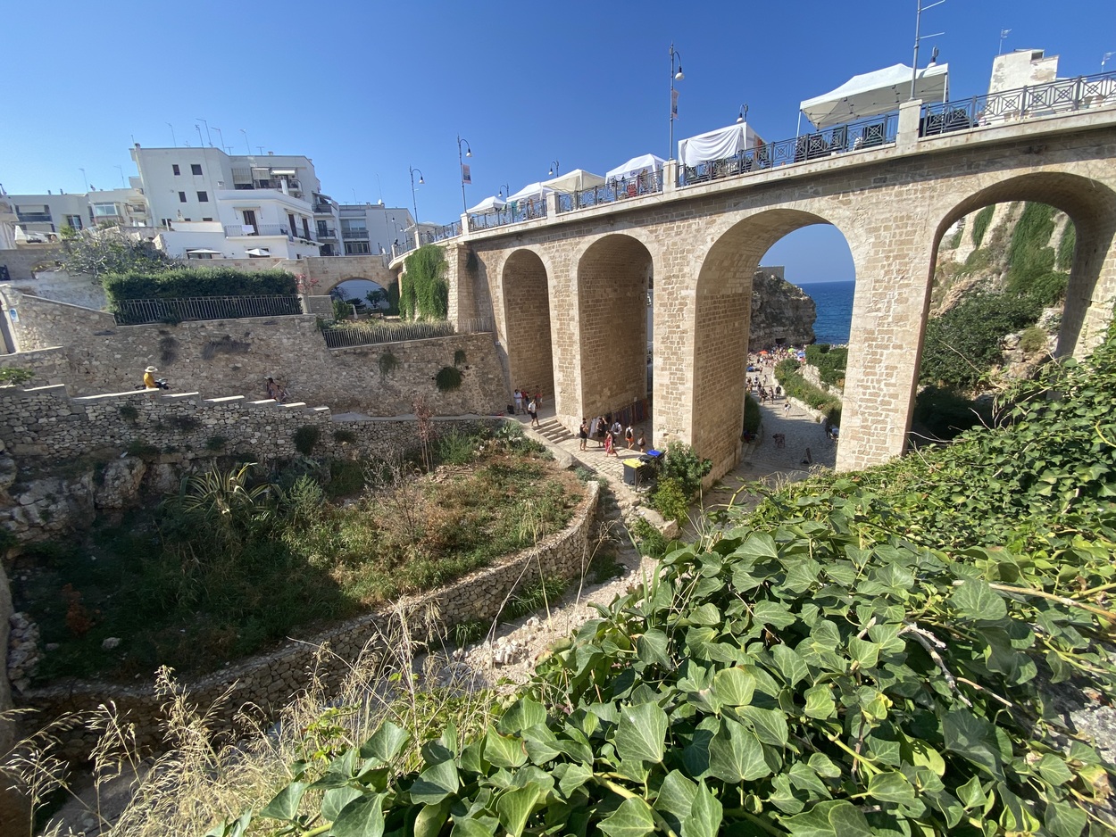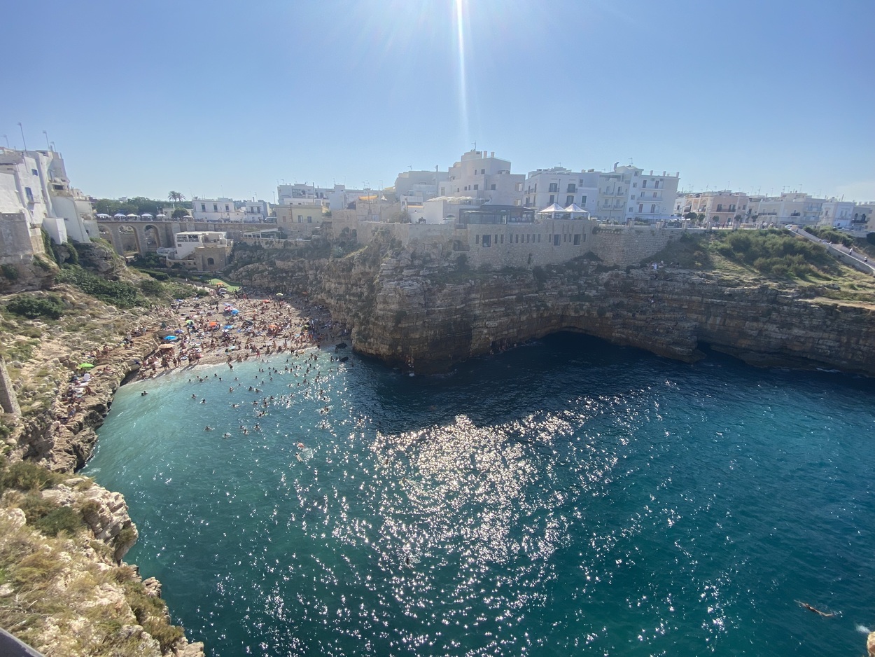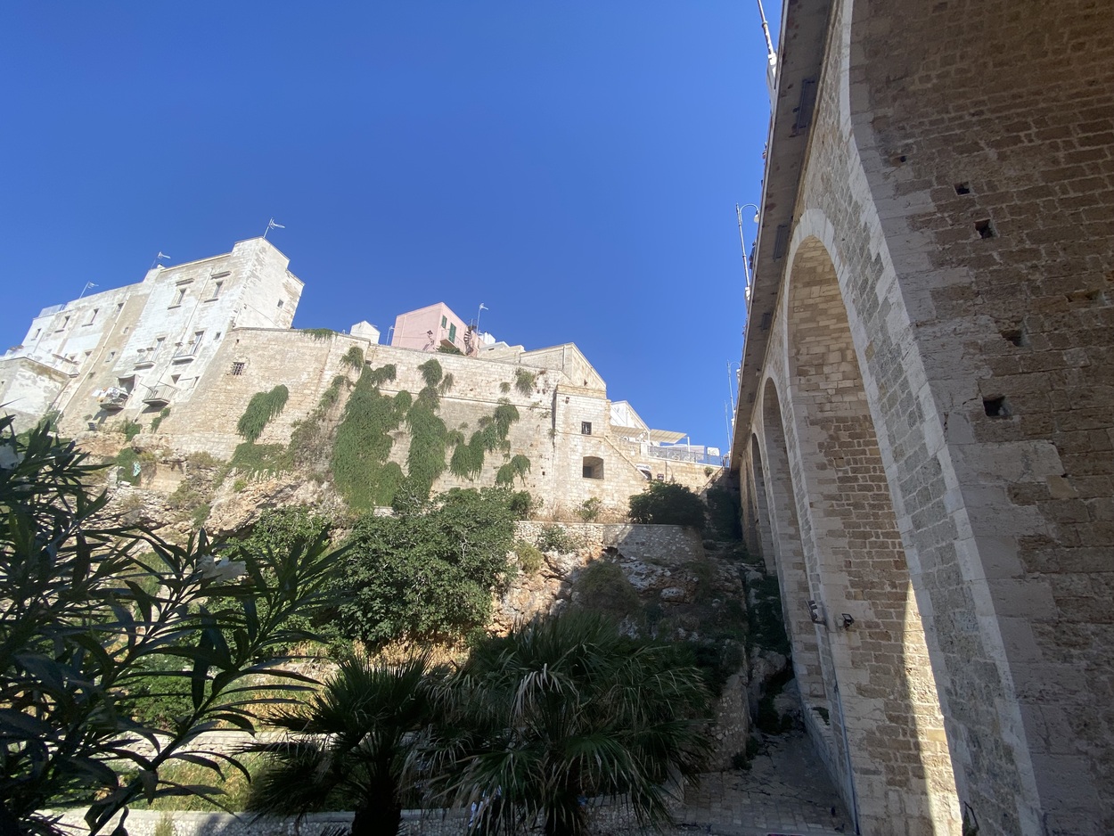 Город расположен на высокой прибрежной скале, которая словно бы отступает, давая место бухте Lama Monachile - на пляже всегда полно народу. Синее море и волны, бьющиеся о скалы... Немного напоминает Португалию.