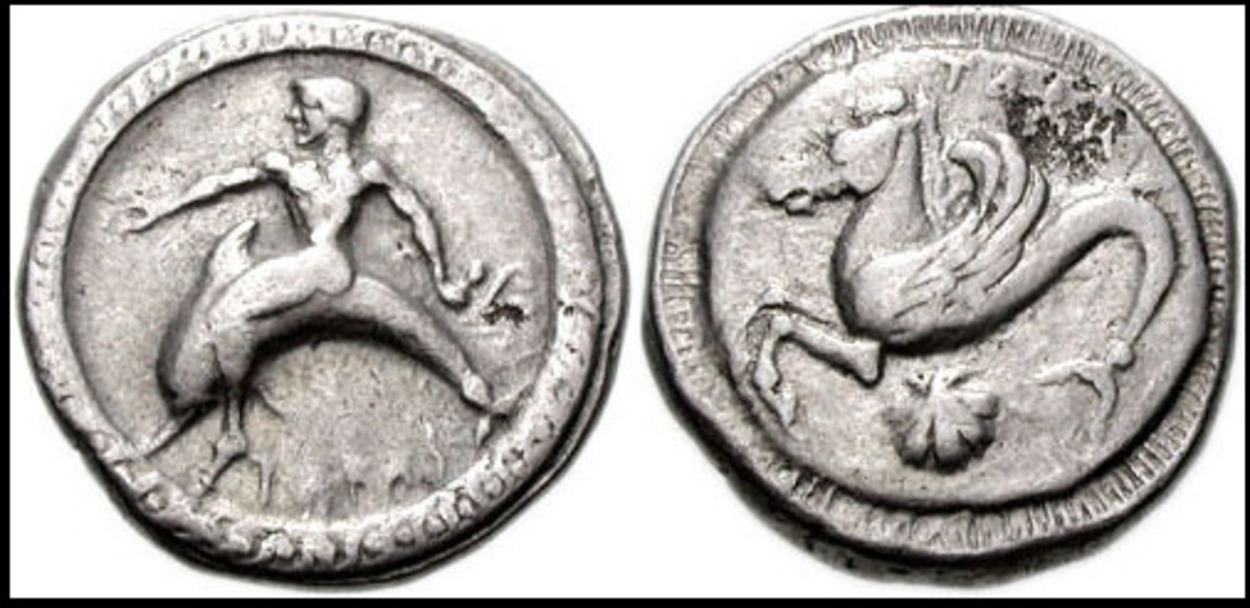 Морская тематика, естественно, отражена на гербе Таранто, который скопирован с древних монет. На гербе изображён молодой морской бог, сидящий на дельфине, в его руках трезубец и развевающаяся ткань. На нем красные бусы и золотая раковина. И надпись «Тарас» — старое название города. Фото из Википедии.