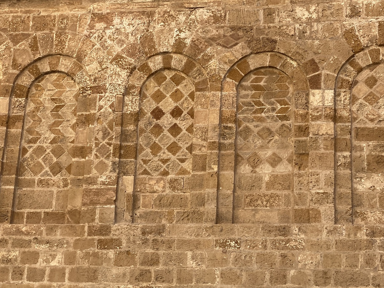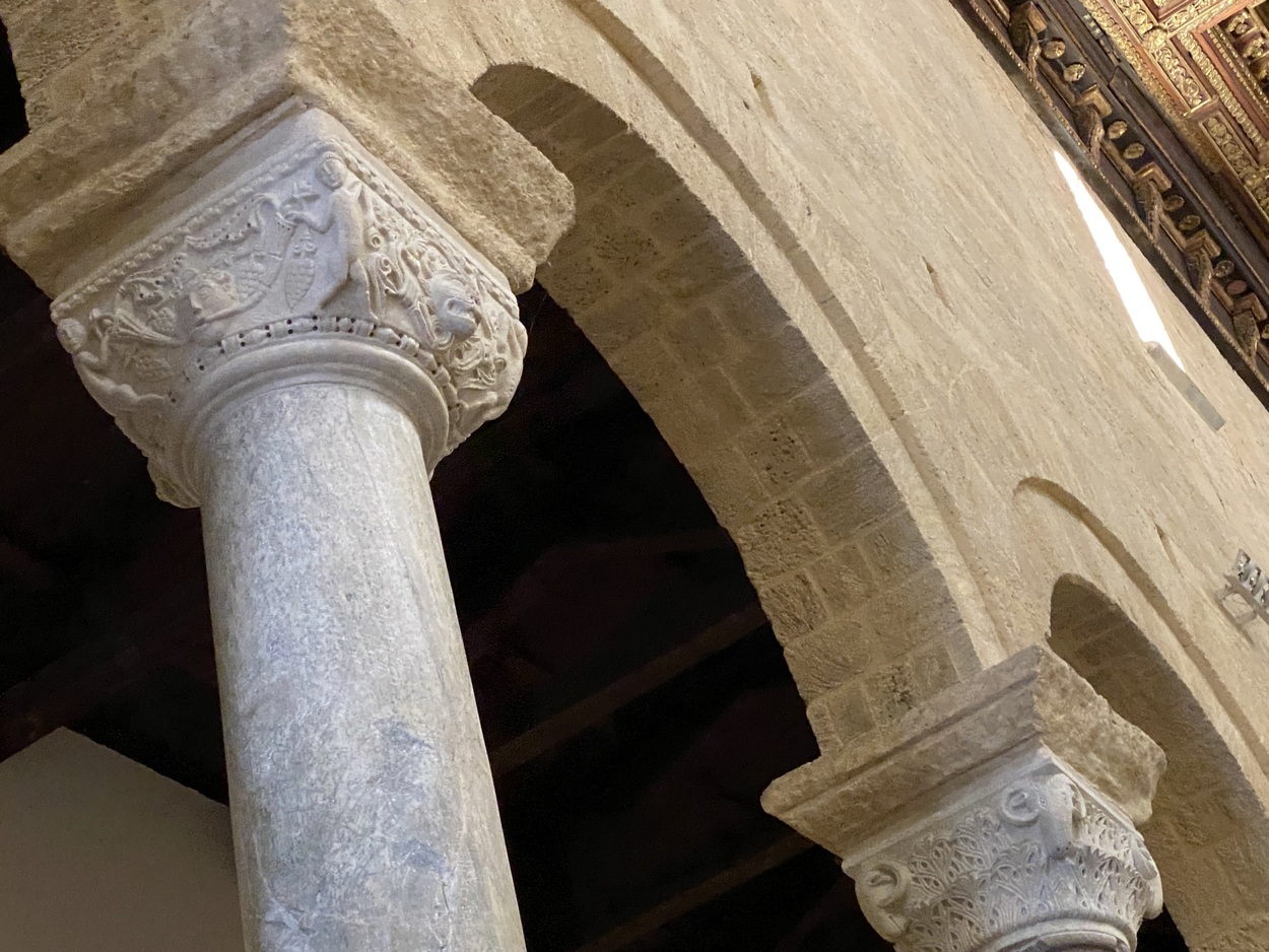 Это видно по колоннам, которые отличаются друг от друга по размеру капителей и материалу. В XI веке первоначальную византийскую церковь в форме греческого (равностороннего) креста преобразовали в базилику, которую мы видим. Строительные леса по бокам свидетельствуют о медленной, но имеющей место реставрации исторического центра.