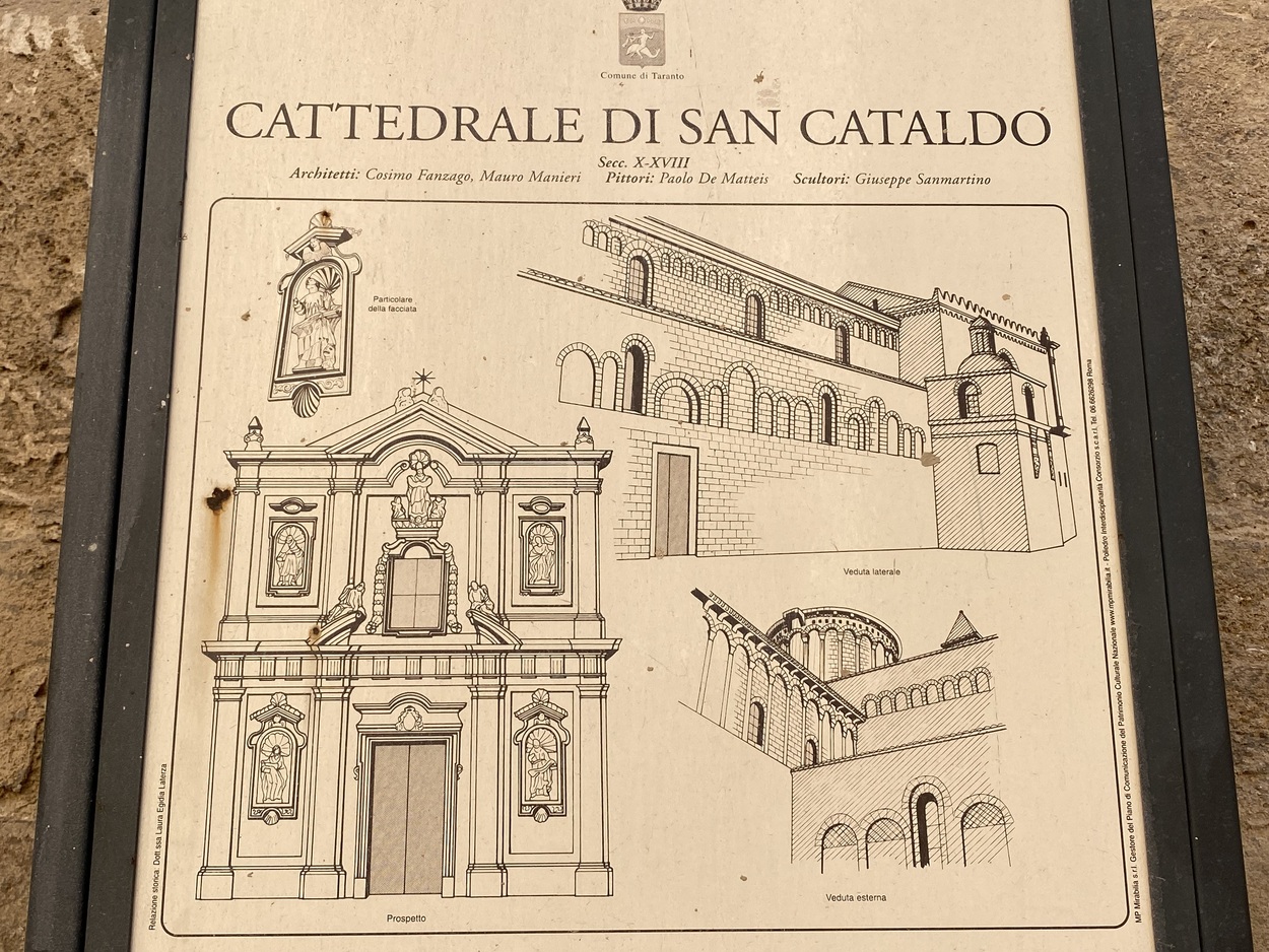 В XII веке построили колокольню, в XVIII в. появился довольно невыразительный барочный фасад, в верхней части которого статуя покровителя храма святого Катальда. Его биография необычна. Монах, родом из Ирландии, отправился в паломничество на Святую землю. На обратном пути корабль, на котором он плыл, потерпел кораблекрушение близ Таранто, Катальд чудом спасся и остался в Таранто, где позже стал епископом. Похоронен в соборе.