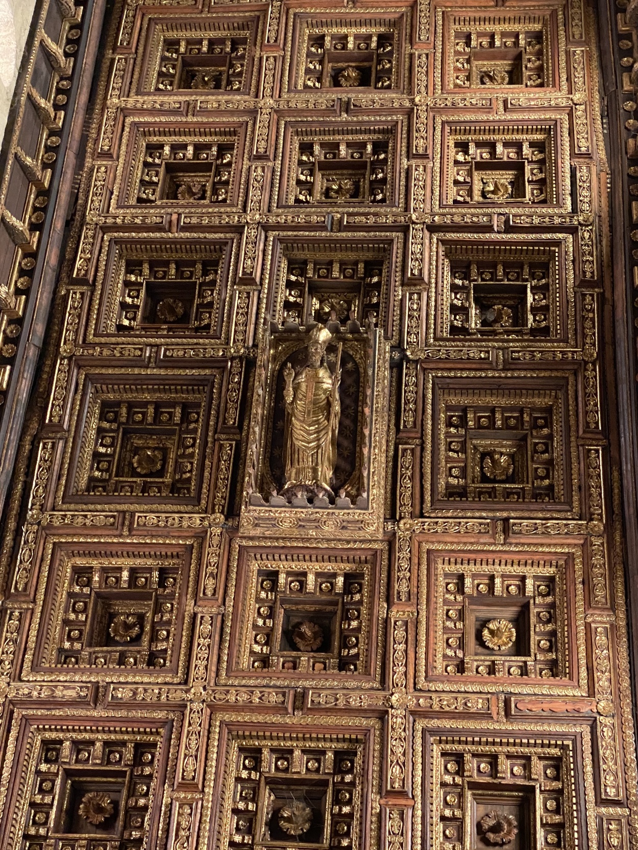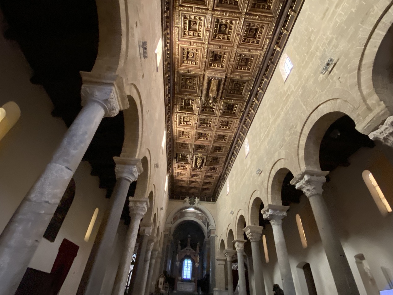 Внутри трехнефной базилики, кроме колонн из цветного мрамора, интересен деревянный кессонный потолок с богатой резьбой.