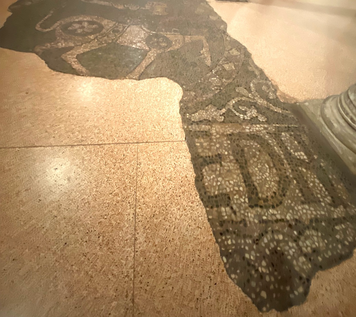 Еще фрагментарно сохранилась напольная мозаика, которая представляла знаменитый античный сюжет "Полет Александра Македонского на грифонах".