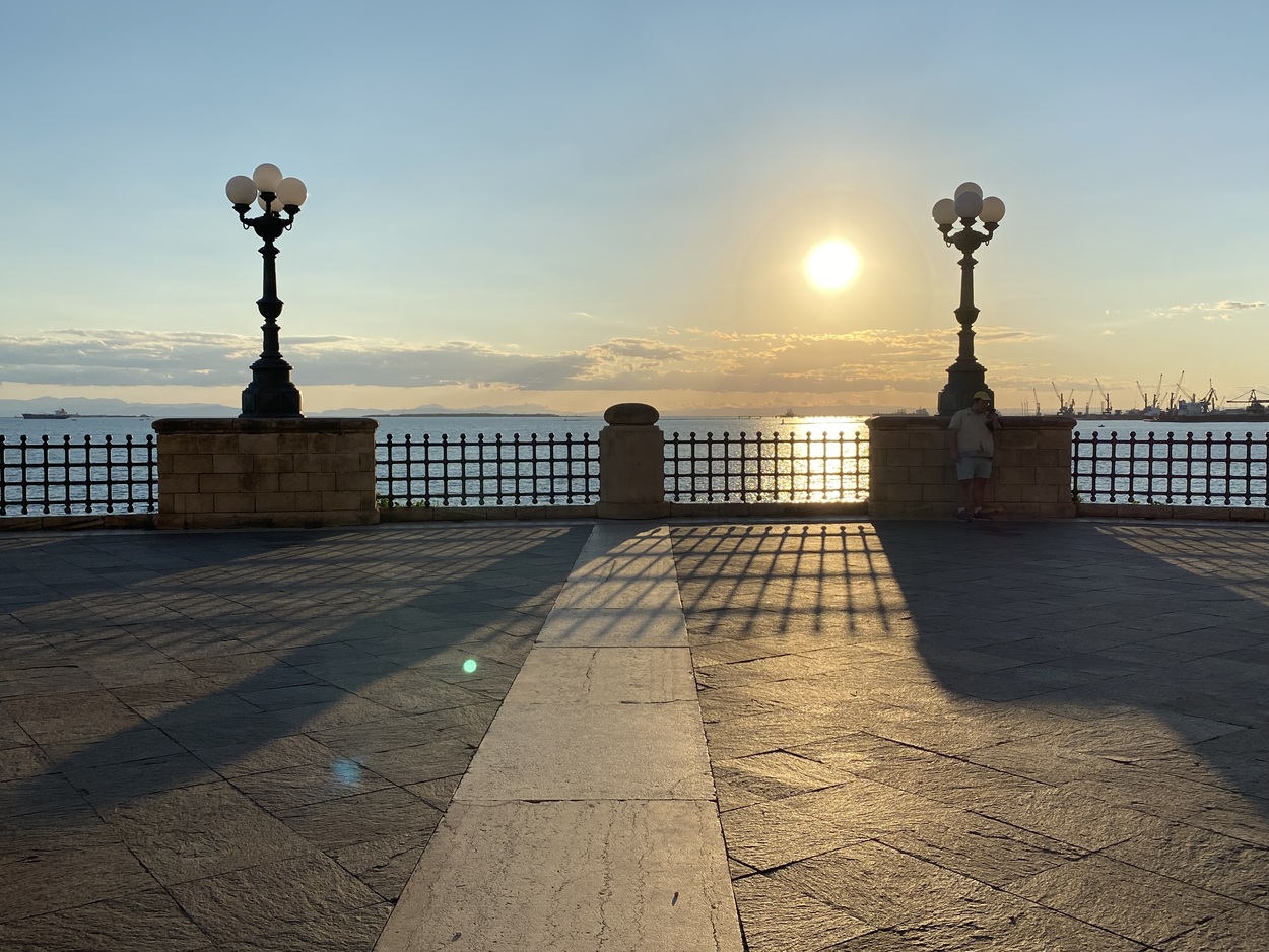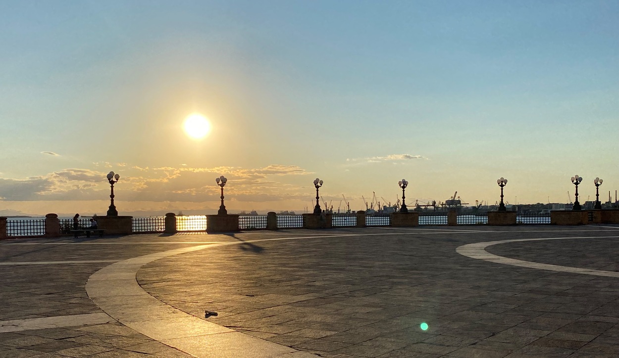 Вторым ярусом, ближе к воде, идет пешеходная дорожка в тени деревьев Passeggiata Alessandro Leogrande, по ней можно дойти до небольшого городского пляжа